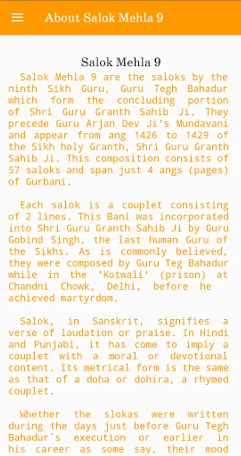 Salok Mehla 9 are the saloks by the ninth Sikh Guru, Guru Tegh Bahadur which form the concluding portion of Shri Guru Granth Sahib Ji. They precede Guru Arjan Dev Ji's Mundavani and appear from ang 1426 to 1429 of the Sikh holy Granth, Shri Guru Granth Sahib Ji. This composition consists of 57 saloks and span just 4 angs (pages) of Gurbani.