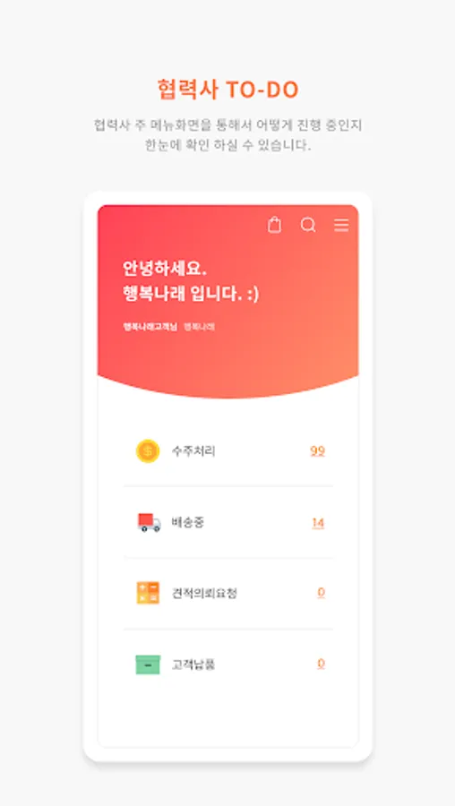 - Customer company: TO-DO, product search, order cart, request for new items, approval/rejection of order payment, payment history, order delivery status, stocking status