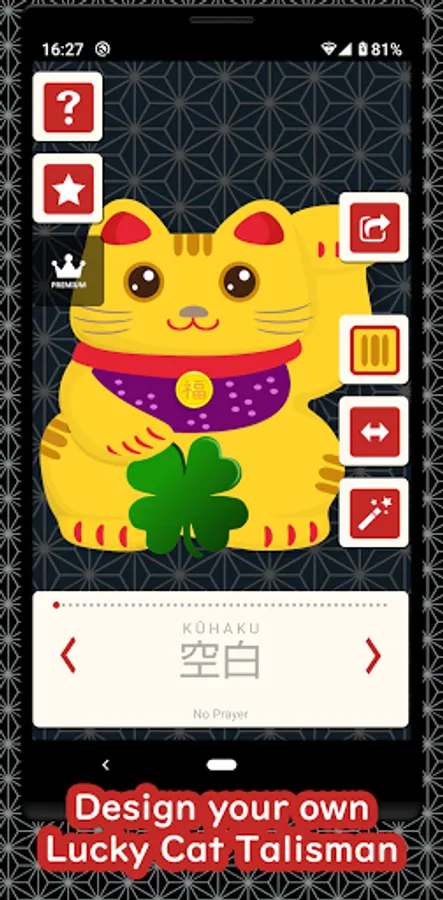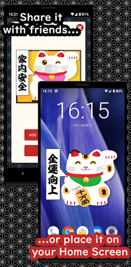 Design your own "Lucky Cat" and place it as a widget on your Home screen or share it with your friends on Twitter, Instagram, Facebook, etc.
