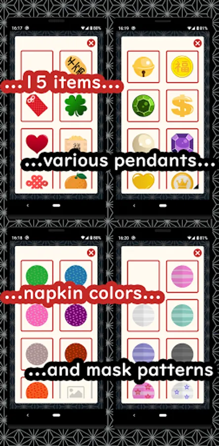 Choose from 15 items the cat can be holding: Koban (a gold coin), Lucky Charm, Four-leaf Clover, Heart, Box of Beans, Present, Horseshoe, Gold Fish, Yin and Yang Symbol, etc.