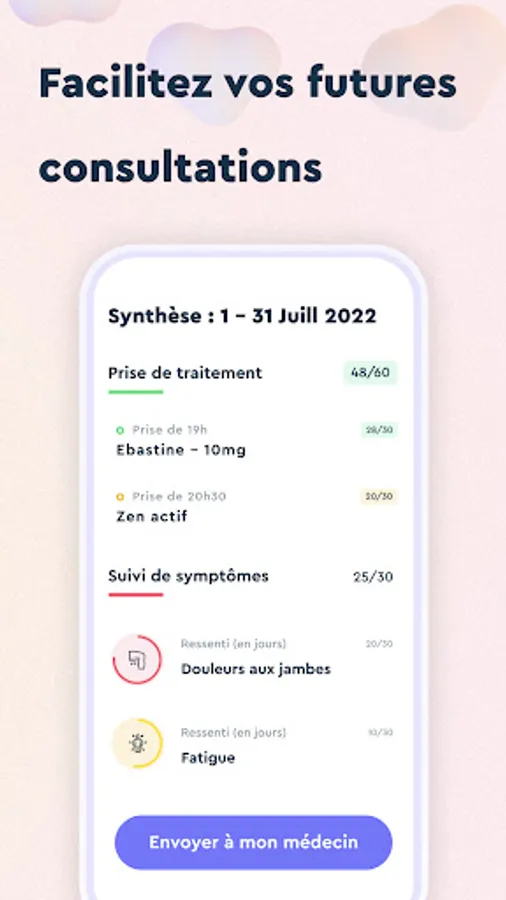 - Your last appointment with your doctor was 6 months ago? It is always difficult to synthesize everything you have experienced in 30 minutes of consultation. It is now possible thanks to our health summaries. In one click you can send your treatment scores to your doctor, as well as a summary of your symptoms for the last 6 months. This will help your doctor to better understand your daily life with your pathology and your treatment.
