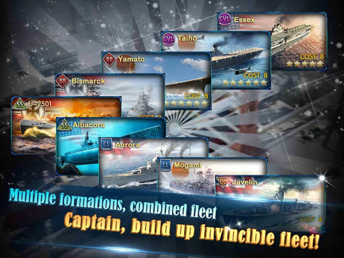 Aircraft, Battlships, Battlecruiser, Light Cruiser, Heavy Cruiser, Destroyer and submarines! 7 types of ships, hundreds of arrangement! Build your own unique invincible fleet!