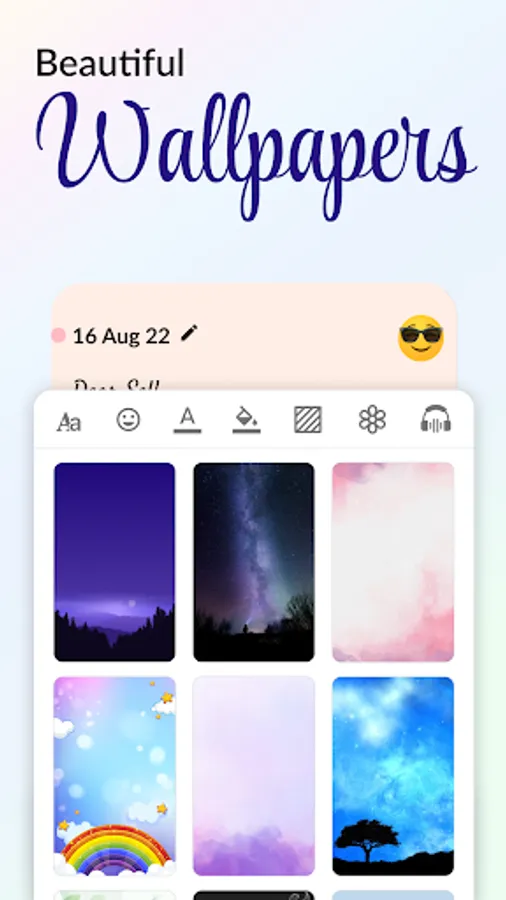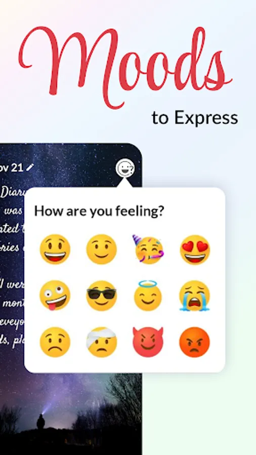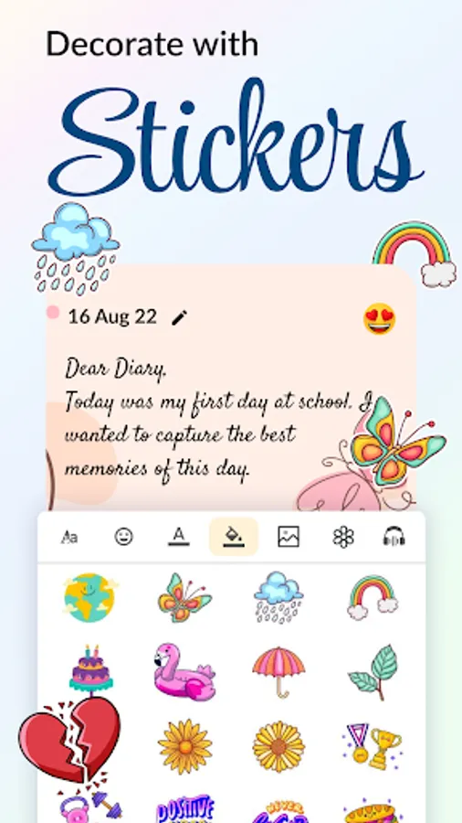 Express yourself with emojis: My Personal Diary App offers you a large database of beautiful icons for your personalised activities. Choose emojis to express yourself freely and reflect your mood.