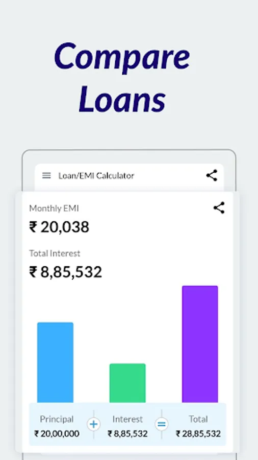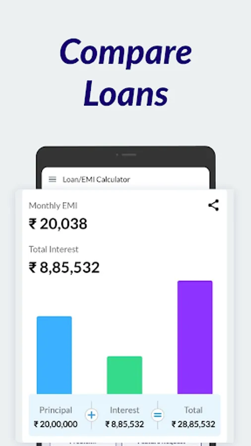 Compare loan offers: The EMI Calculator app allows you to compare multiple loan offers be it personal loans, vehicle loans, home loans from different banks and financial institutions side-by-side, so you can choose the best deal for your needs.