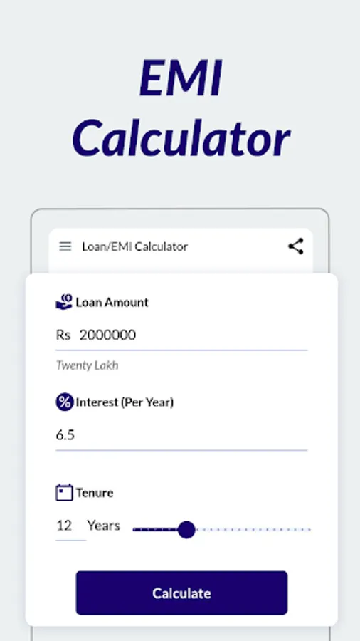 With our EMI Calculator, you can effortlessly plan your Equated Monthly Instalments (EMIs) for various loans and financial products. Whether you're financing your education, purchasing your dream car, buying a new home, or seeking a personal loan, our app provides you with accurate calculations based on the loan amount, interest rate, and loan tenure. Stay informed about the total interest payable and choose the most suitable repayment plan that fits your budget.