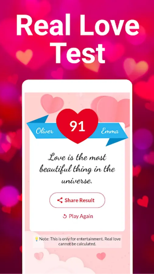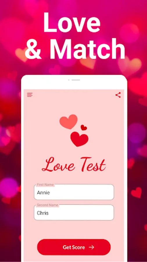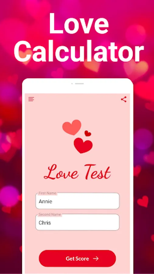 Finding real love is tough. Saying "I love you" to your loved one is even tougher. Being in a lasting relationship with your partner is the toughest. But checking your love score with your heartthrob is easy with this love tester app. It is usually said "Life is the flower for which love is the honey." Love is the greatest power in existence. Its presence can be deeply felt wherever it resides. When someone is in love, they realise love can overcome everything and can magnificently transform intricate situations to the better. Having a soulmate in life makes everything beautiful. The great difficulty of love, however, is that it is challenging to find the right words to express what you are feeling, and to find out whether what you are feeling is actually "love". Having a lasting relationship with your soulmate is a dream everyone has. No one really wants a loveless life. Being liked by your heartthrob is the ultimate gift of life. Having a compatible relationship with unrequited love life is something we all work towards.Looking to find out if you are in love with someone? If you are, this love test calculator app is exactly what you are looking for.