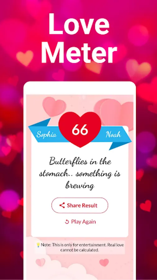 Disclaimer: Please note the love tester app has been developed only for fun, entertainment purposes and has no intention to hurt any user's feelings whatsoever. The application uses numerical algorithm to determine love match based and should be used only for fun.