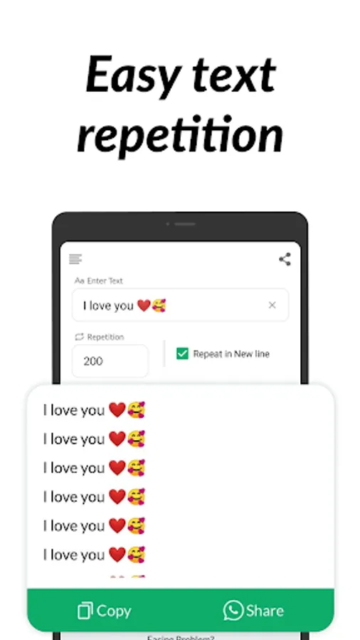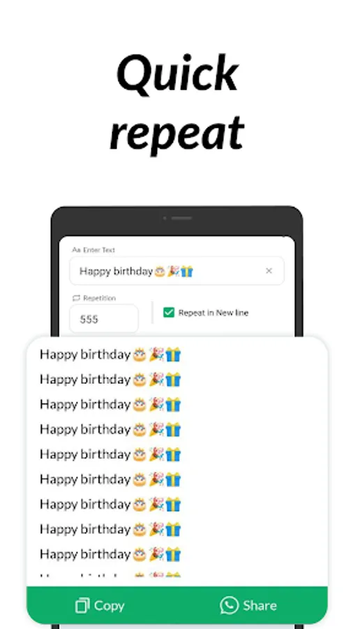 Whether you're looking to generate long blocks of text for testing or to create multiple instances of a specific phrase, Text Repeater is the tool for you.We are constantly working hard on making the "Text repeater app for android" app better and more fun for you and text spammer friends. We need your constant support to get going to make Text duplicator your go-to app. Please feel free to send us an email for any queries/suggestions/problems or if you just want to say hi. We would love to hear from you.