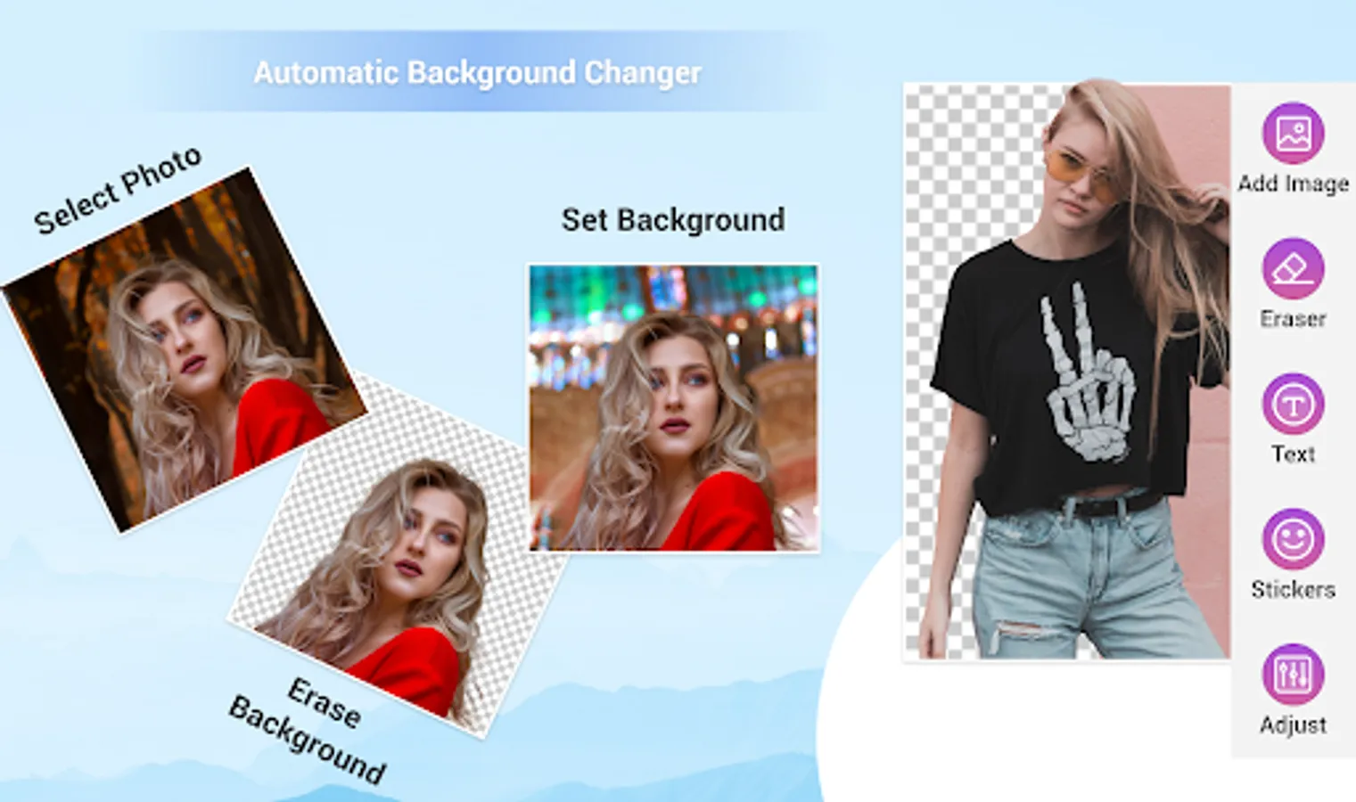 Automatic Background Eraser - Background Changer app you can also do photo editing. It provides facilities like add stickers, add text or change the text colour, Adjust background, Eraser, add image and apply backgrounds. You can also choose multiple backgrounds to set your image.