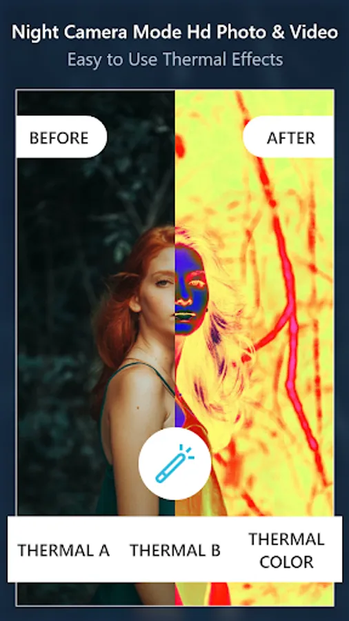 From this app you can also use the Thermal effect Use this app to explore your world in virtual reality with Thermal effects and take photos with a predator infrared thermal vision effect. You can also set the timer in thermal effect before clicking the pics, or you can set the thermal effect colors, add flashlight, and many more filter effects are given you can set them while you are clicking the pics.