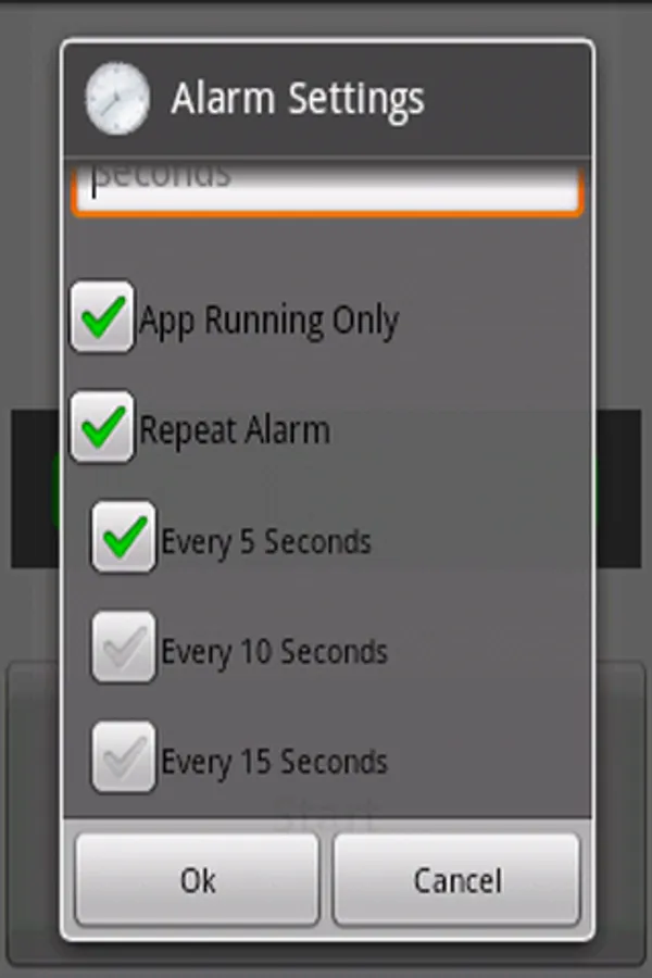 - Also, in the settings menu, you will find options to switch the alarm on or off. You can set it to sound just once or repeatedly every 5, 10 or 15 seconds. The repeat on option will repeat at set intervals as chosen for one minute or until the stop button is pressed. You can also set the alarm to go off only while the app is running or irrespective of whether the app is running or not.