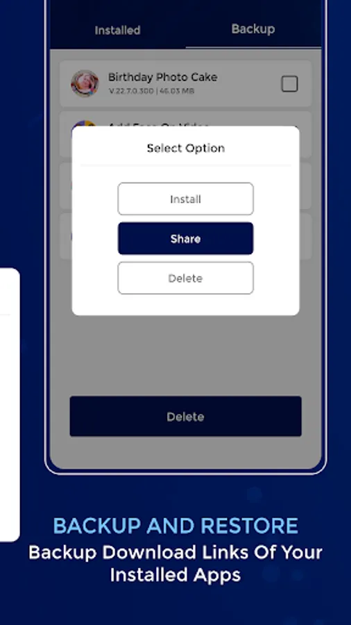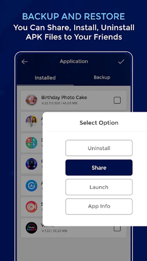 In Apps backups and restore, you can backup APK files of Apps to local storage. While restoring apps, it will automatically reinstall all your selected apps. You can also check the size of apps, share APKs with your friends, uninstall App, launch App, backup App. Backing up your apps will save your data charges and usage in case of uninstalling the app, you can install it again from your backup file.