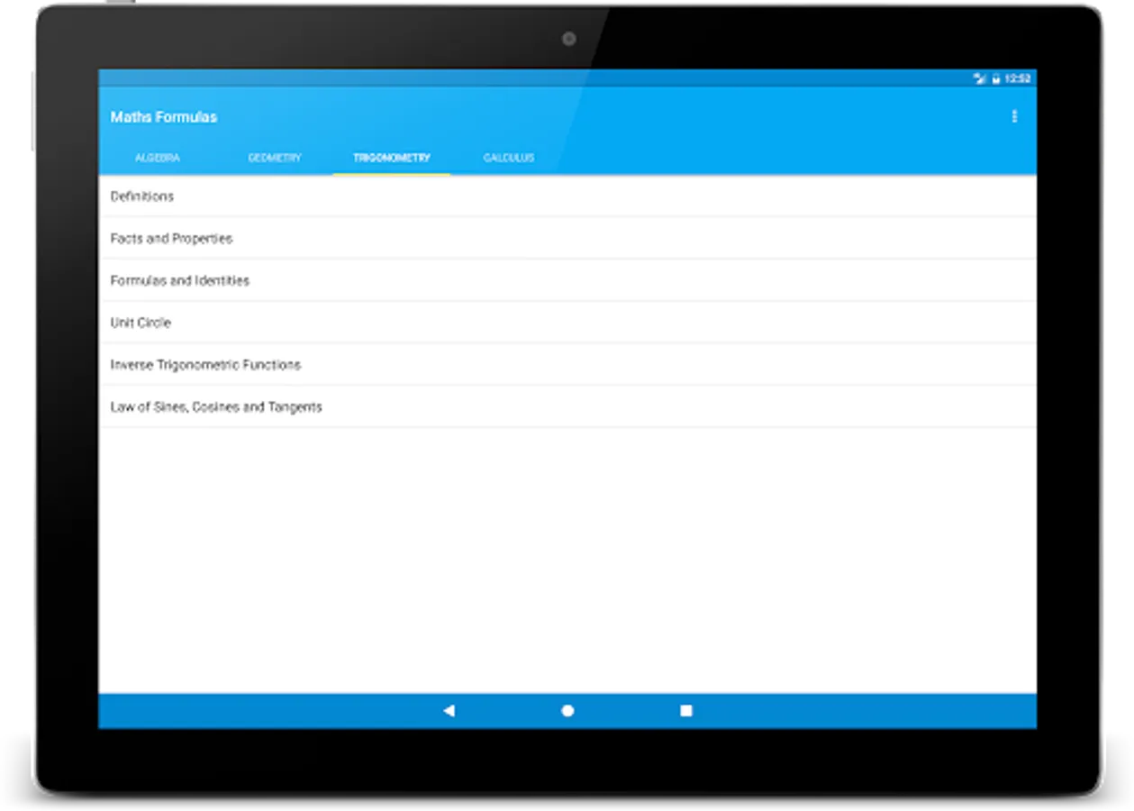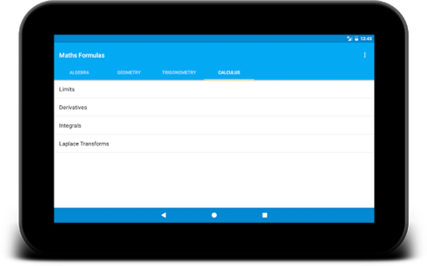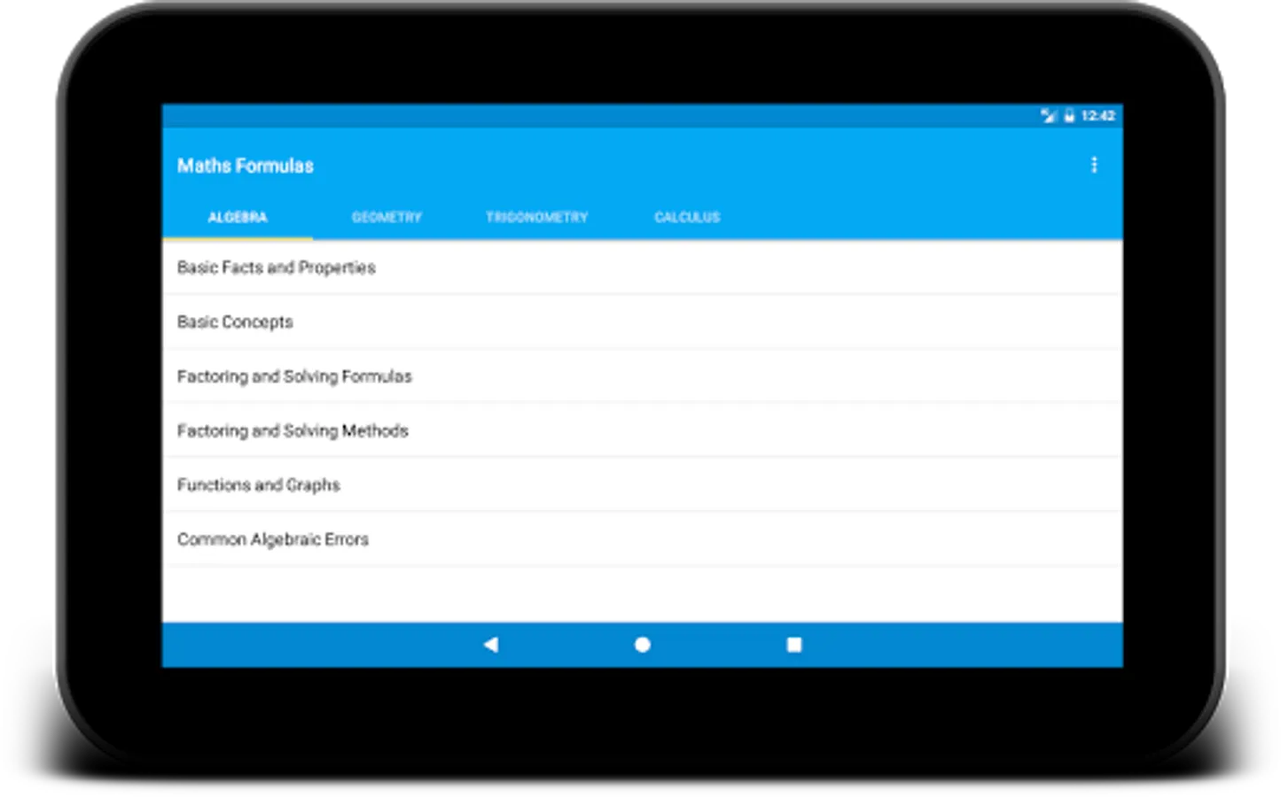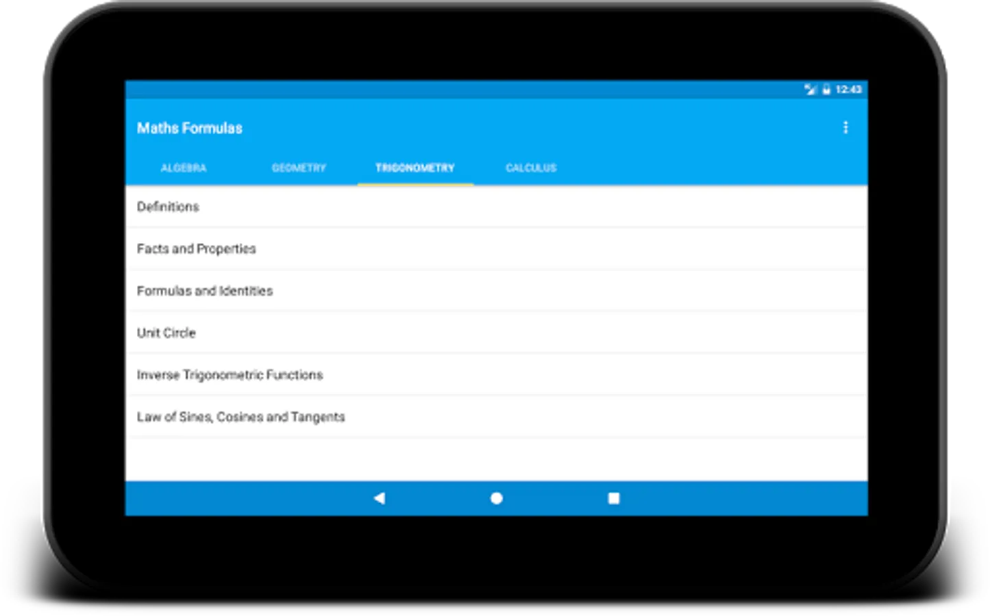 Maths Formulas is one unique and comprehensive application that is particularly designed as a one-stop solution for students. It lists out all the important formulas and topics in Algebra, Geometry, Trigonometry and Calculus. The topics covered are: