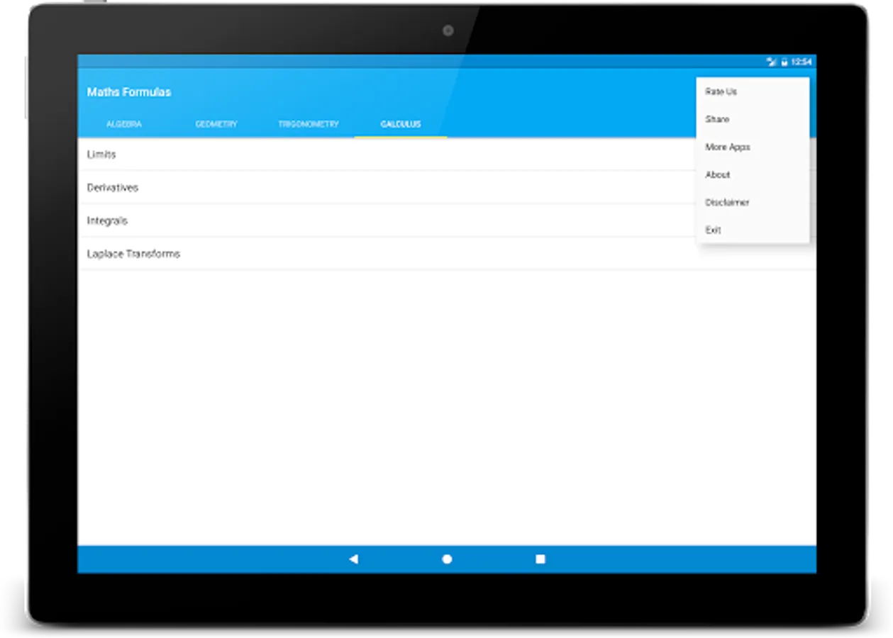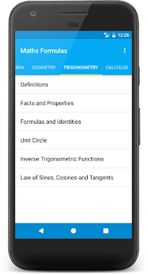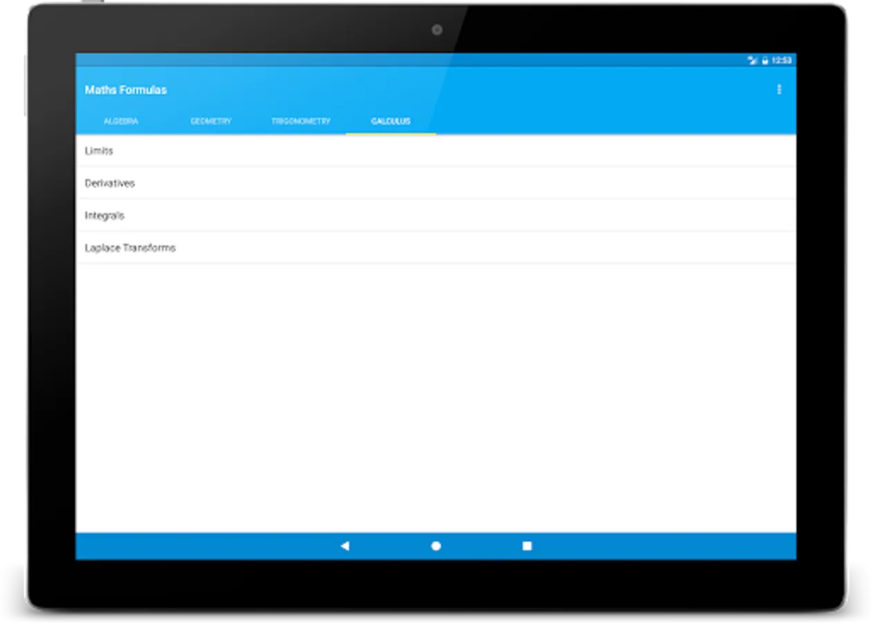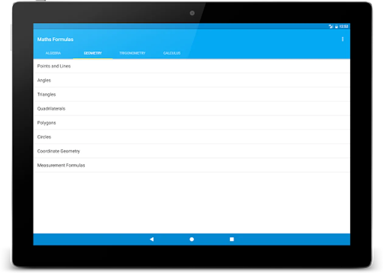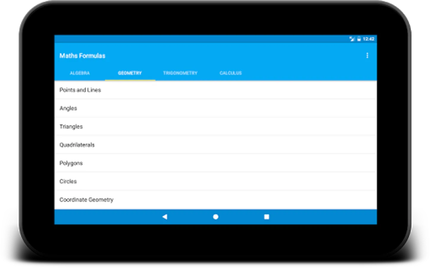 Maths Formulas is one unique and comprehensive application that is particularly designed as a one-stop solution for students. It lists out all the important formulas and topics in Algebra, Geometry, Trigonometry and Calculus. The topics covered are: