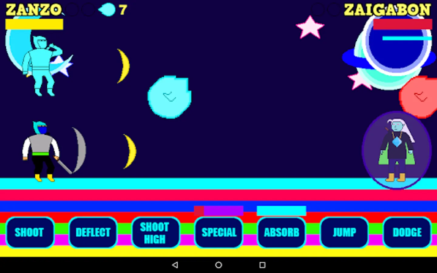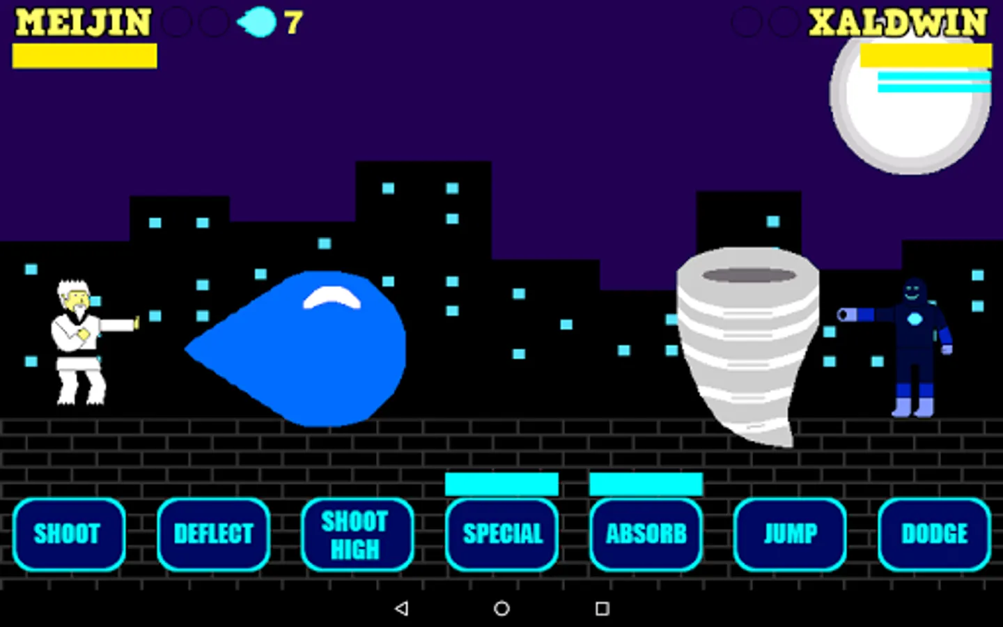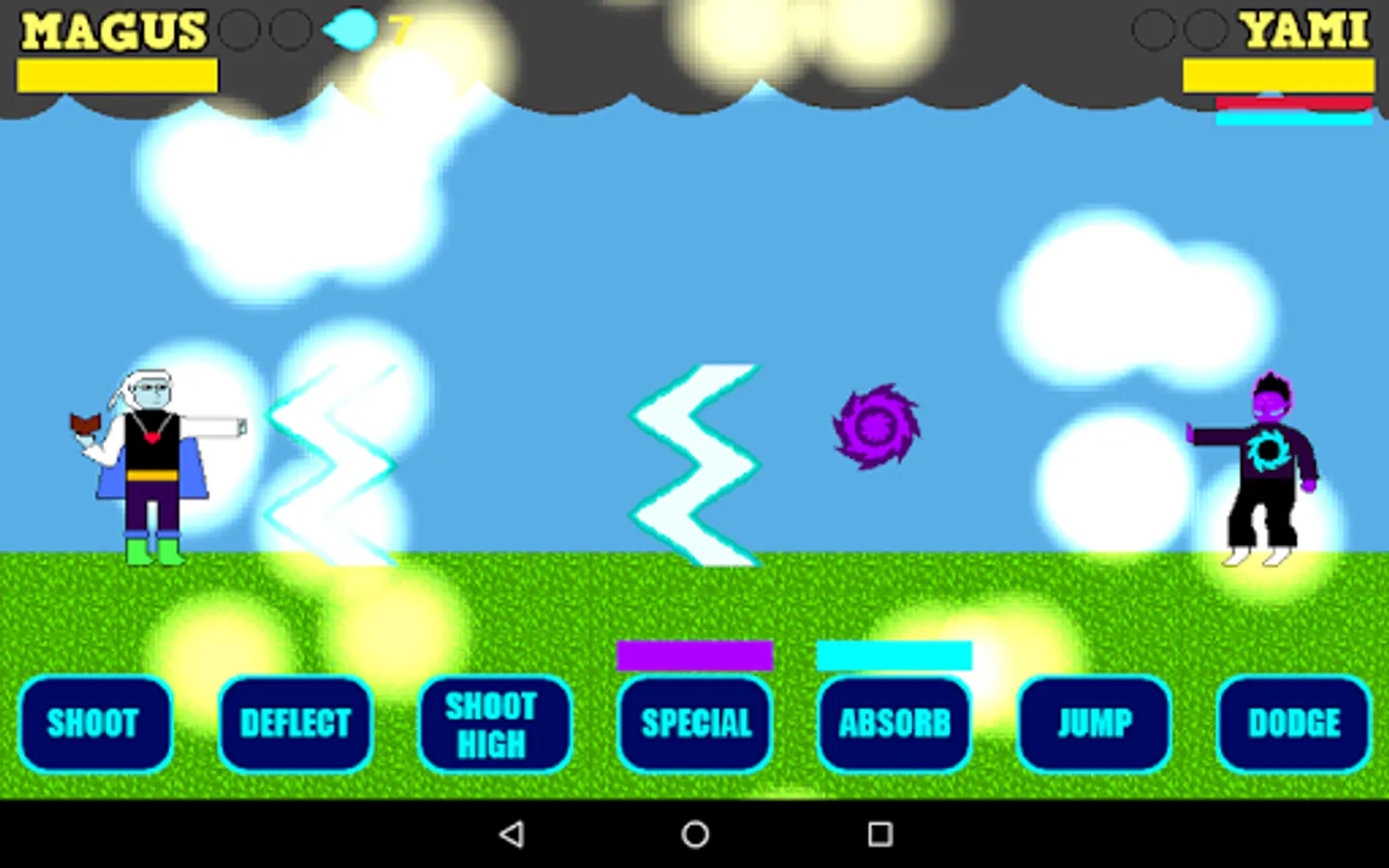 Projectile Fighter is a challenging arcade game where you can choose from a large variety of unique characters with multiple abilities to fight against a gauntlet of characters in a battle of projectiles. Projectile Fighter is like a fighting game but mainly projectiles are used to determine the outcome of a match. Projectile fighters can use a variety of elements for projectiles including light, dark, wind, magma, earth, lightning, aqua, fire, ice, plant and unique. Unique would apply to any projectile that does not fall under any of the other elements. All elements with the exception of unique have a weakness(an element they are weak to) and a counter(an element they counter). All characters have an affinity/element that determines their strongest element, elements they are resistant to and elements they can absorb. Projectile fighters can use basic techniques to attack by throwing projectiles in various directions(horizontally or diagonally upwards while standing and diagonally downwards while jumping) and they can defend themselves by deflecting, dodging jumping over and/or absorbing projectiles. Projectile fighters can also use a long list of special techniques for attacking, defending or powering themselves up. All characters are capable of using any technique but they are most likely to use their favorite techniques. Read the in-game guide/manual to get more information about the mechanics, techniques and terminology associated with the game. Projectile Fighter includes music and features a soundtrack with 7 tracks. Various types of projectiles include light energy, dark vortex, tornado(wind), magma ball, meteor(earth), lightning bolt, aqua ball, fire ball, ice spike, leaf(plant), wood(plant), ki energy, diamond, energy beam, eye beam, shock wave, shuriken, twilight energy, twilight vortex and star. Various classes/types of characters include normal, android, mage, swordsman, ninja, hybrid, alien and deity. Various types of stages and what they consist of include... Light stage - a heavenly sky, clouds and a bright sun. Dark stage - a city at night with skyscrapers and a full or crescent moon. Wind stage - a meadow and a giant tornado. Magma stage - a volcano full of lava that constantly erupts. Earth stage - a rocky area with big mountains. Lightning stage - rain and lightning bolts. Aqua stage - a waterfall. Fire stage - blue flames. Ice stage - snow, an icy ground, mountain and pine trees. Plant stage - a green forest full of grass and trees. Unique stage - outer space, a rainbow ground, celestial bodies, planets, a blackhole, a moon, a sun and an abundance of stars. Projectile Fighter is a very hard game that requires good reflexes, reactions, patience and focus in order to succeed.