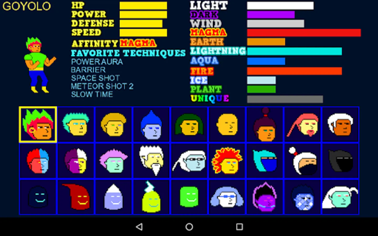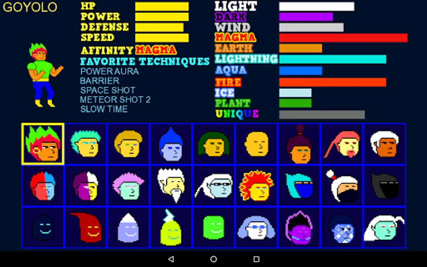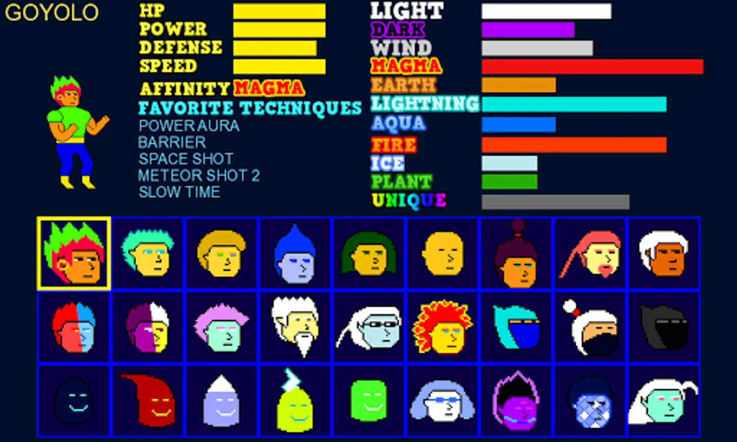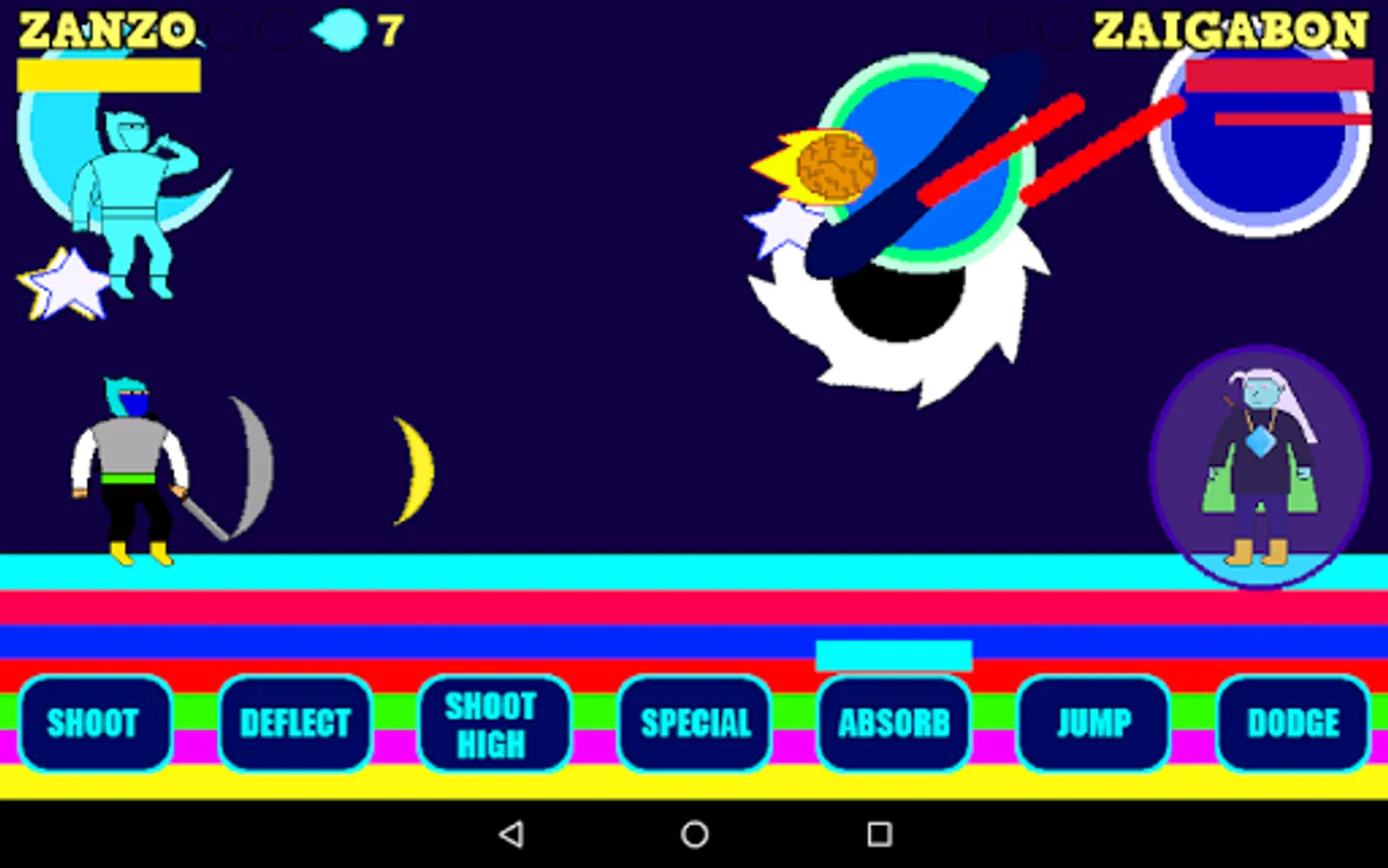 Projectile Fighter is a challenging arcade game where you can choose from a large variety of unique characters with multiple abilities to fight against a gauntlet of characters in a battle of projectiles. Projectile Fighter is like a fighting game but mainly projectiles are used to determine the outcome of a match. Projectile fighters can use a variety of elements for projectiles including light, dark, wind, magma, earth, lightning, aqua, fire, ice, plant and unique. Unique would apply to any projectile that does not fall under any of the other elements. All elements with the exception of unique have a weakness(an element they are weak to) and a counter(an element they counter). All characters have an affinity/element that determines their strongest element, elements they are resistant to and elements they can absorb. Projectile fighters can use basic techniques to attack by throwing projectiles in various directions(horizontally or diagonally upwards while standing and diagonally downwards while jumping) and they can defend themselves by deflecting, dodging jumping over and/or absorbing projectiles. Projectile fighters can also use a long list of special techniques for attacking, defending or powering themselves up. All characters are capable of using any technique but they are most likely to use their favorite techniques. Read the in-game guide/manual to get more information about the mechanics, techniques and terminology associated with the game. Projectile Fighter includes music and features a soundtrack with 7 tracks. Various types of projectiles include light energy, dark vortex, tornado(wind), magma ball, meteor(earth), lightning bolt, aqua ball, fire ball, ice spike, leaf(plant), wood(plant), ki energy, diamond, energy beam, eye beam, shock wave, shuriken, twilight energy, twilight vortex and star. Various classes/types of characters include normal, android, mage, swordsman, ninja, hybrid, alien and deity. Various types of stages and what they consist of include... Light stage - a heavenly sky, clouds and a bright sun. Dark stage - a city at night with skyscrapers and a full or crescent moon. Wind stage - a meadow and a giant tornado. Magma stage - a volcano full of lava that constantly erupts. Earth stage - a rocky area with big mountains. Lightning stage - rain and lightning bolts. Aqua stage - a waterfall. Fire stage - blue flames. Ice stage - snow, an icy ground, mountain and pine trees. Plant stage - a green forest full of grass and trees. Unique stage - outer space, a rainbow ground, celestial bodies, planets, a blackhole, a moon, a sun and an abundance of stars. Projectile Fighter is a very hard game that requires good reflexes, reactions, patience and focus in order to succeed.