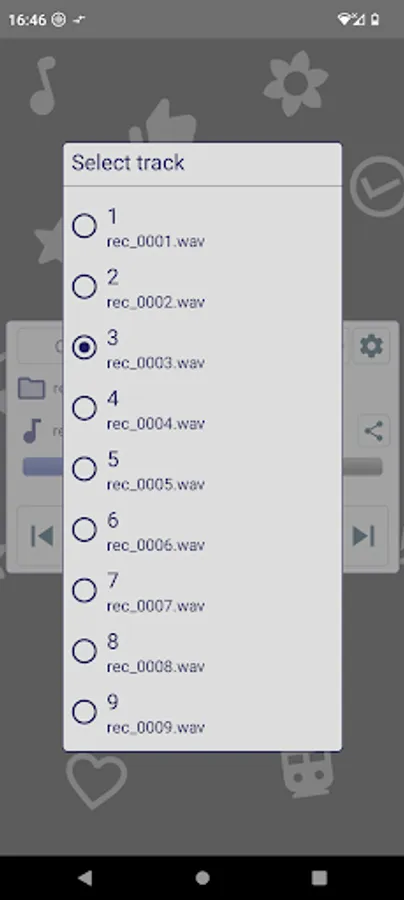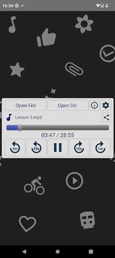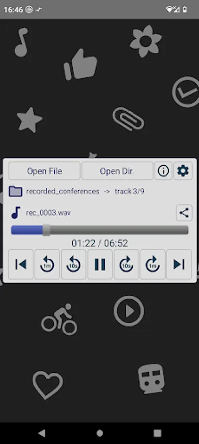 - seekbar, rewind and forward buttons +/-1 min, +/-10 sec.