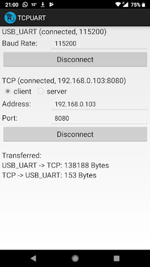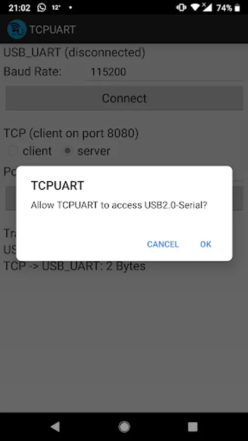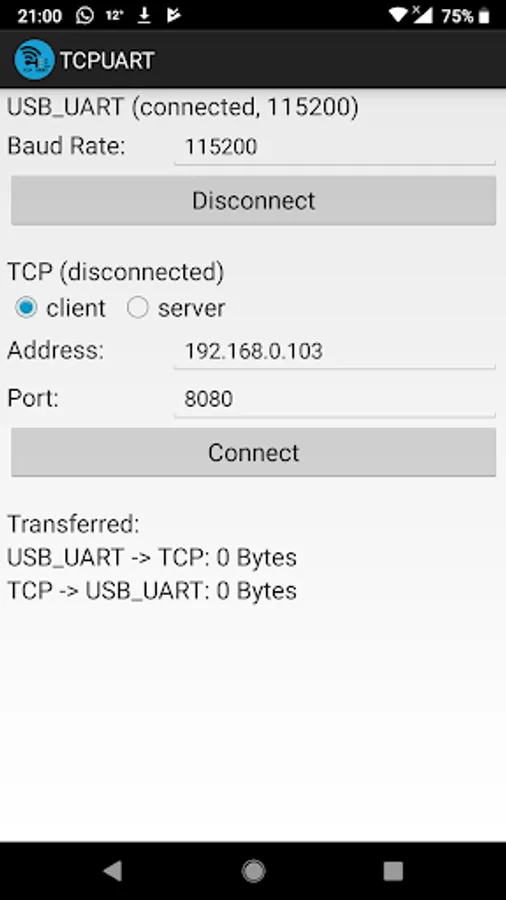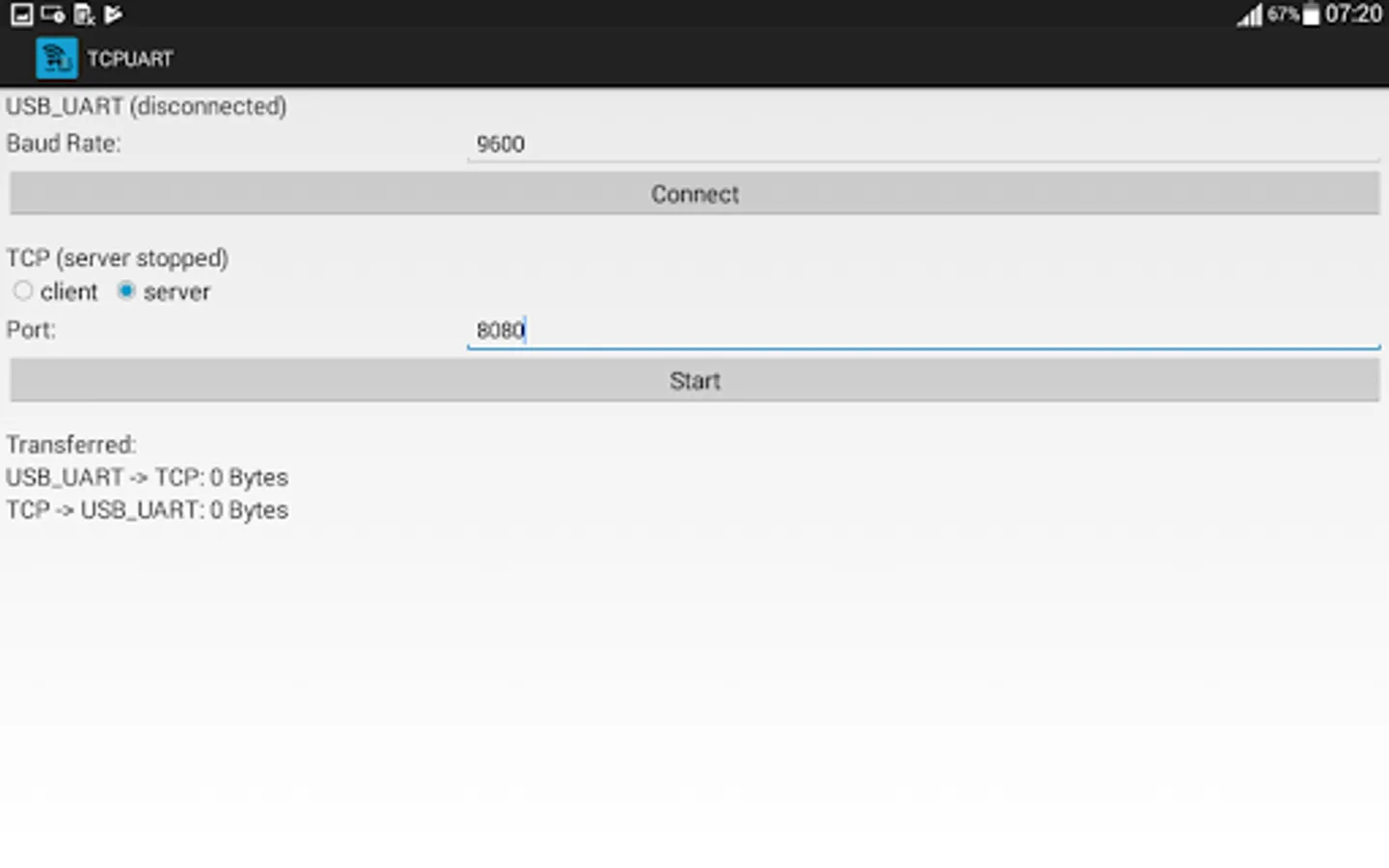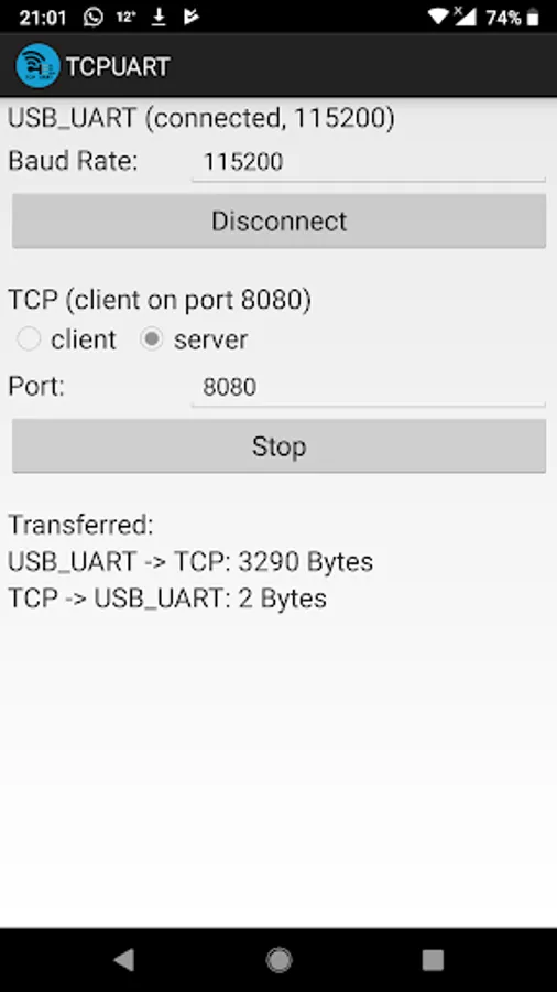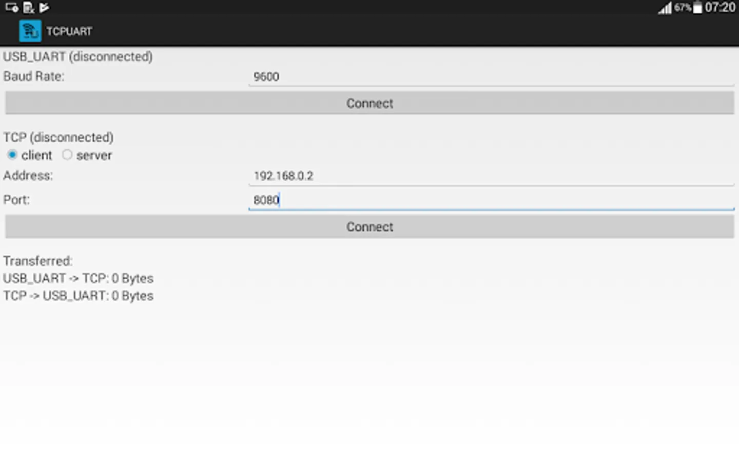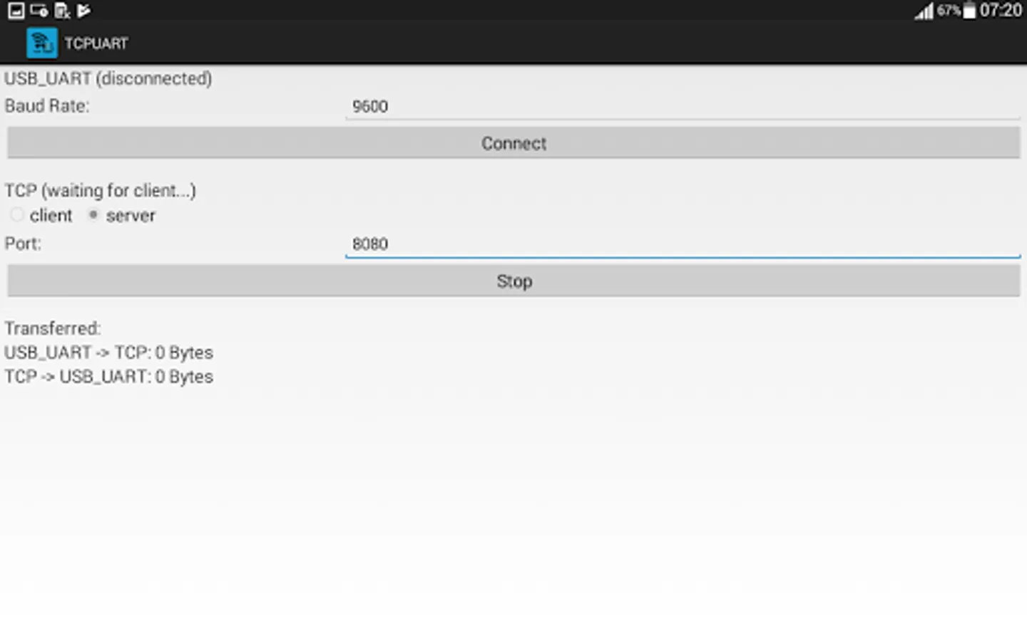 This application allows you to connect an UART (Serial) USB adapter to a TCP socket, to send and receive data.