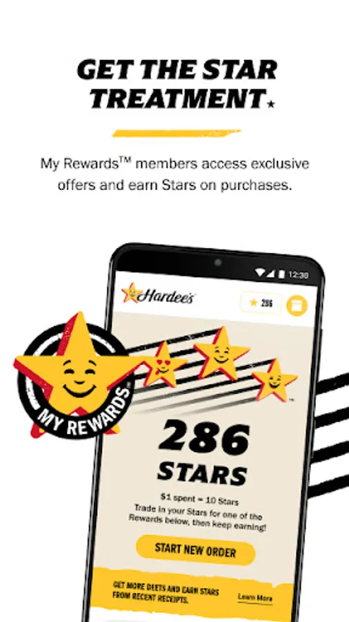 Get rewarded with every bite. Earn 10 Stars for every $1 spent and cash ‘em in for your favorites, like an Apple Turnover or Any Size Fountain Drink for 150 Stars, Hardee Breakfast Platter. Any Size French Fries for 300 Stars. Or 5pc Hand-Breaded Chicken Tenders or Mushroom & Swiss Angus Burger for 500 Stars. Plus, so many other mouthwatering options.