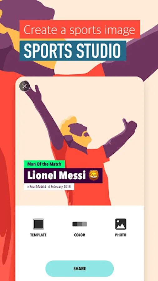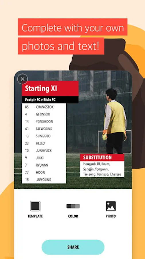 Sports studios can decorate their photos with great news during sports events. It is easy to create multiple contextual images, such as match results, line-up, MOM, and profile, with only a few touches.
