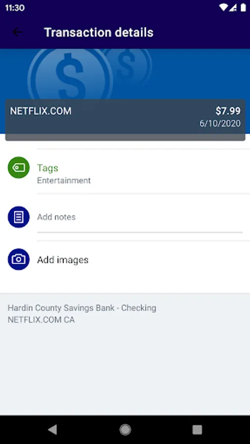 - Keep your transactions organized by allowing you to add tags, notes and photos of receipts and checks.