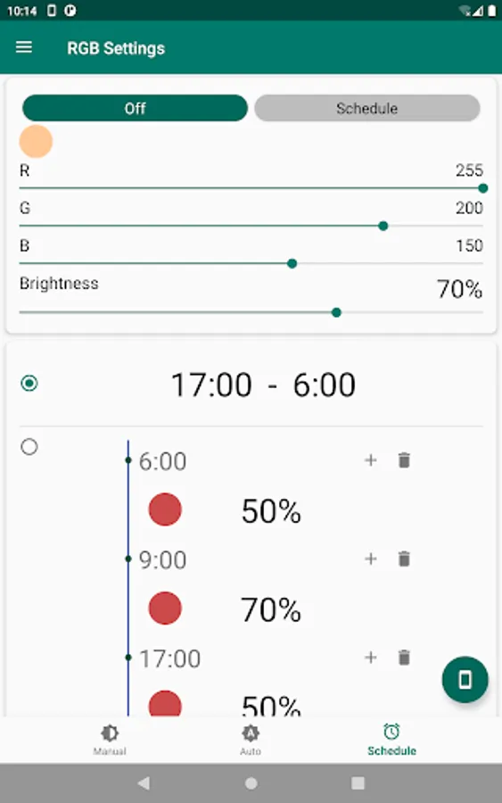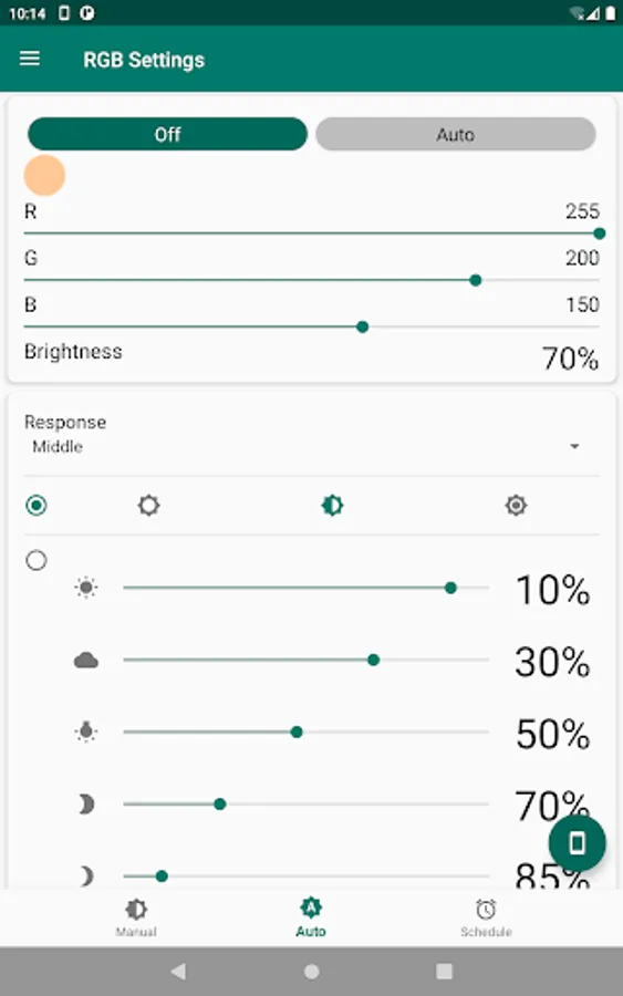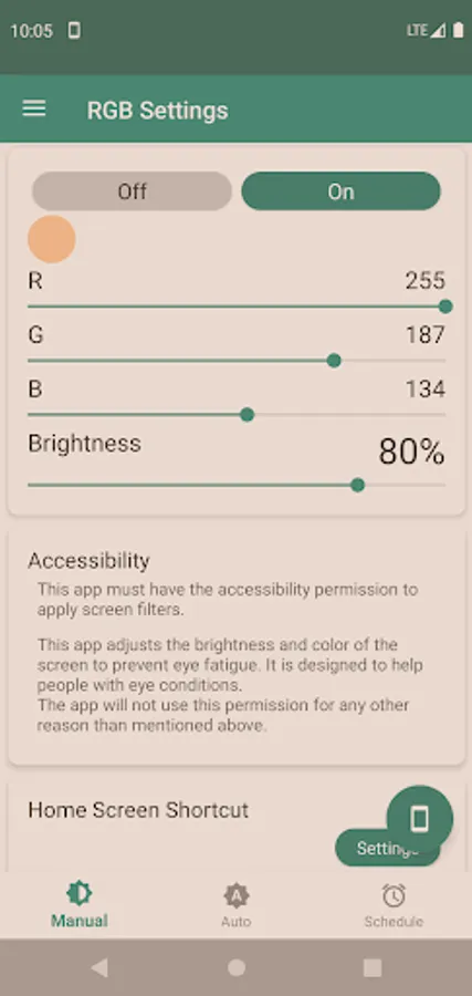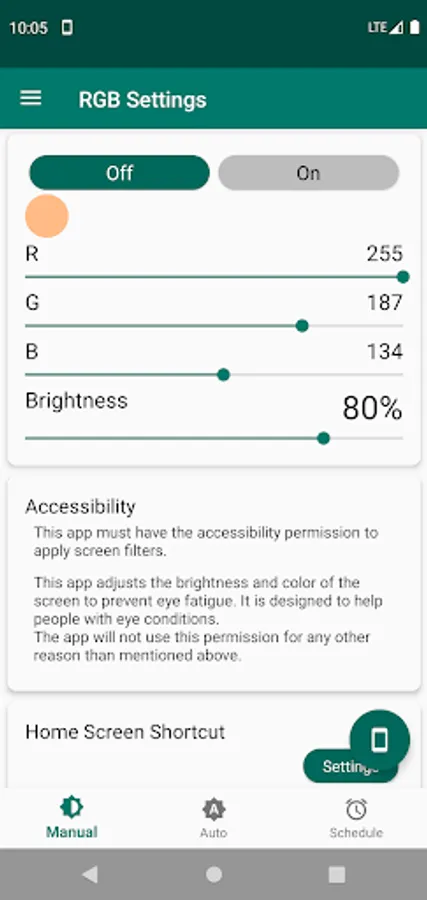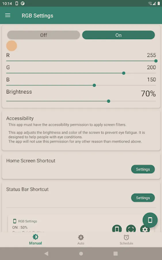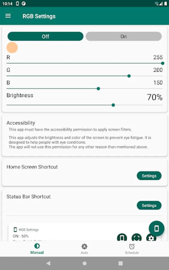 The basic functionalities of RGB Settings are free to use. For those wanting to unlock the full suite of features, we offer a premium version. Our premium features include the ability to apply the screen filter to notification areas, lock screens, and navigation bars. We also provide an Auto Mode that automatically adjusts the screen color based on external brightness, and a Schedule Mode that allows for automatic setting of screen color and brightness according to specific times.