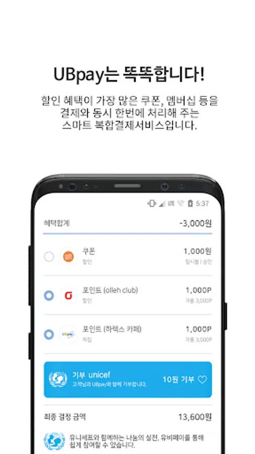 UbiPay is a secure and convenient payment platform that registers credit, check cards, and bank accounts and processes membership and coupons at once by entering a payment password.