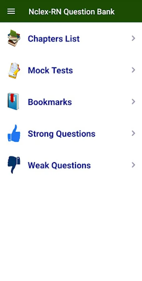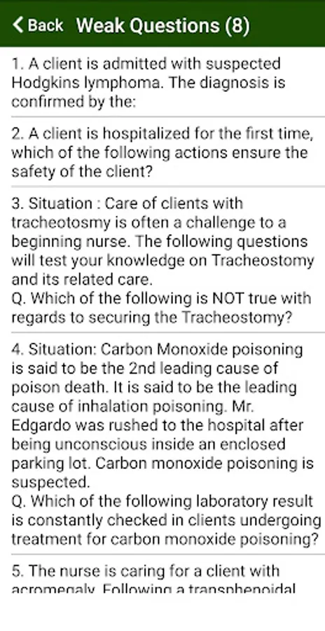 NCLEX-RN Quiz App Gives you an awesome features called Strong & Weak Questions for you to check what are the STRONG & WEAK Questions depends on your score.