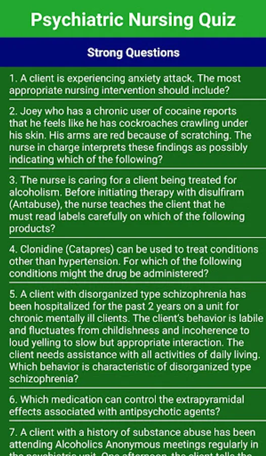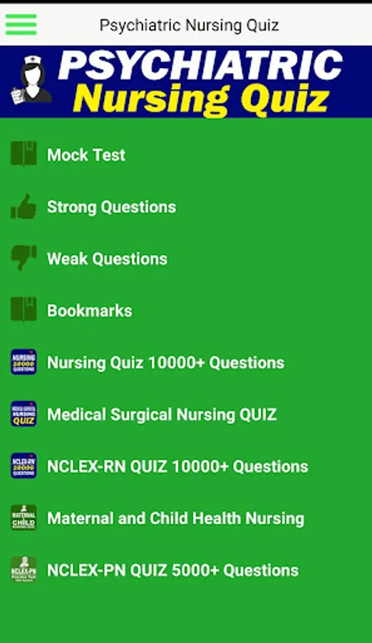 You can get the best practice before your psychiatric nursing exam with huge number of psychiatric nursing / mental health nursing questions which covered all the topics of your psychiatric nursing / mental health nursing syllabus with this App.