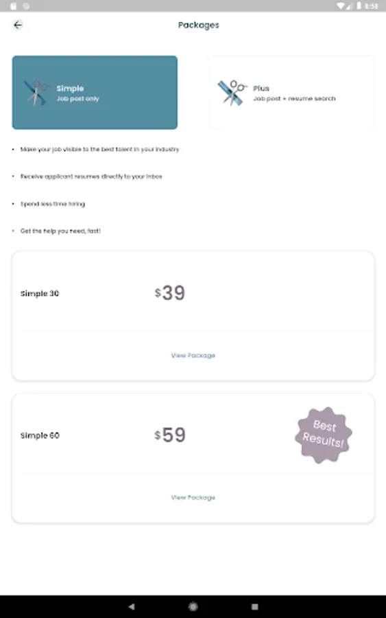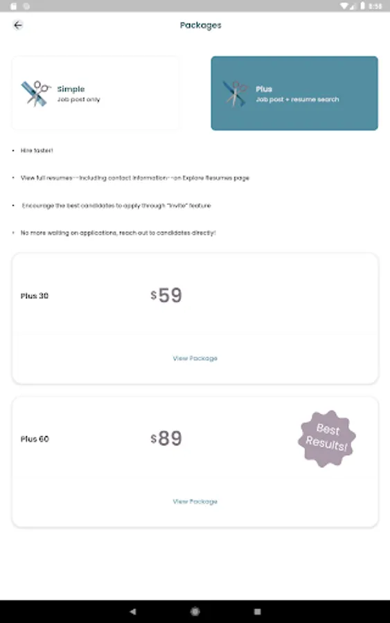 Search through the resumes of qualified candidates and receive applications right in the app. Post your job with our Simple Subscription plans, or upgrade to a Plus Subscription to view resumes and reach out to potential candidates directly.