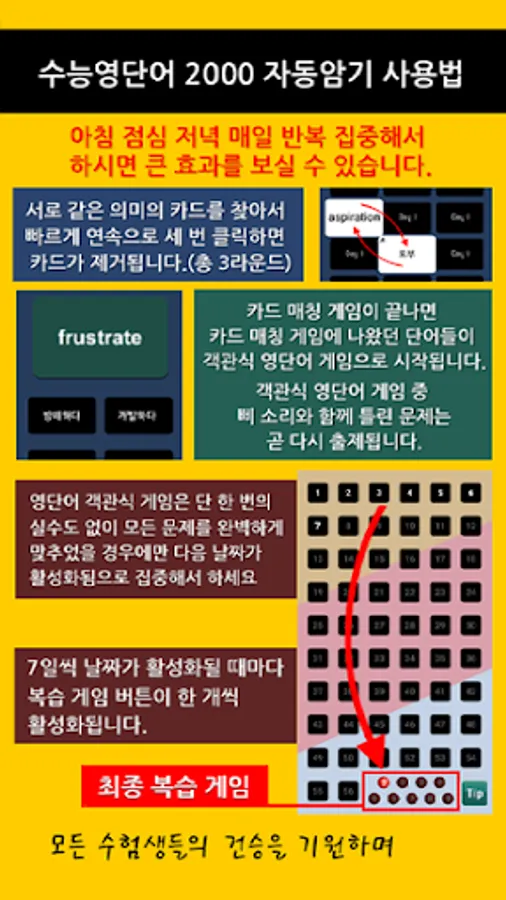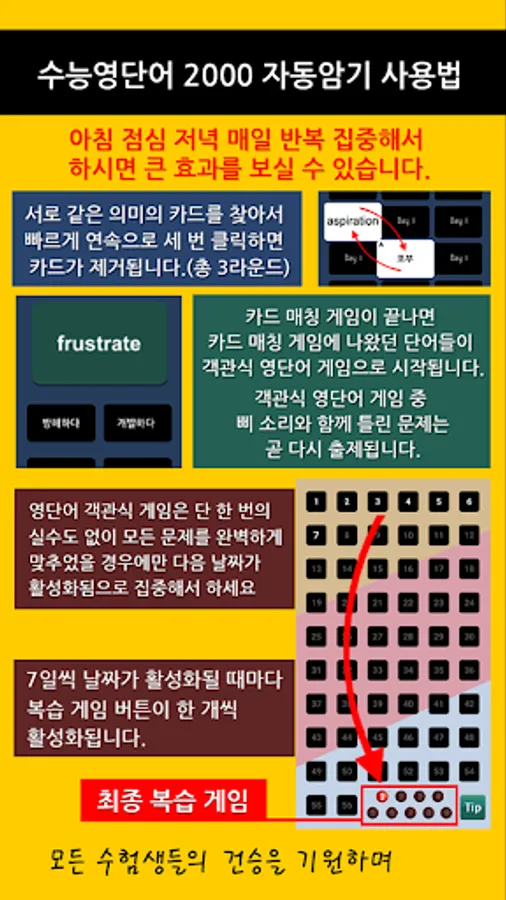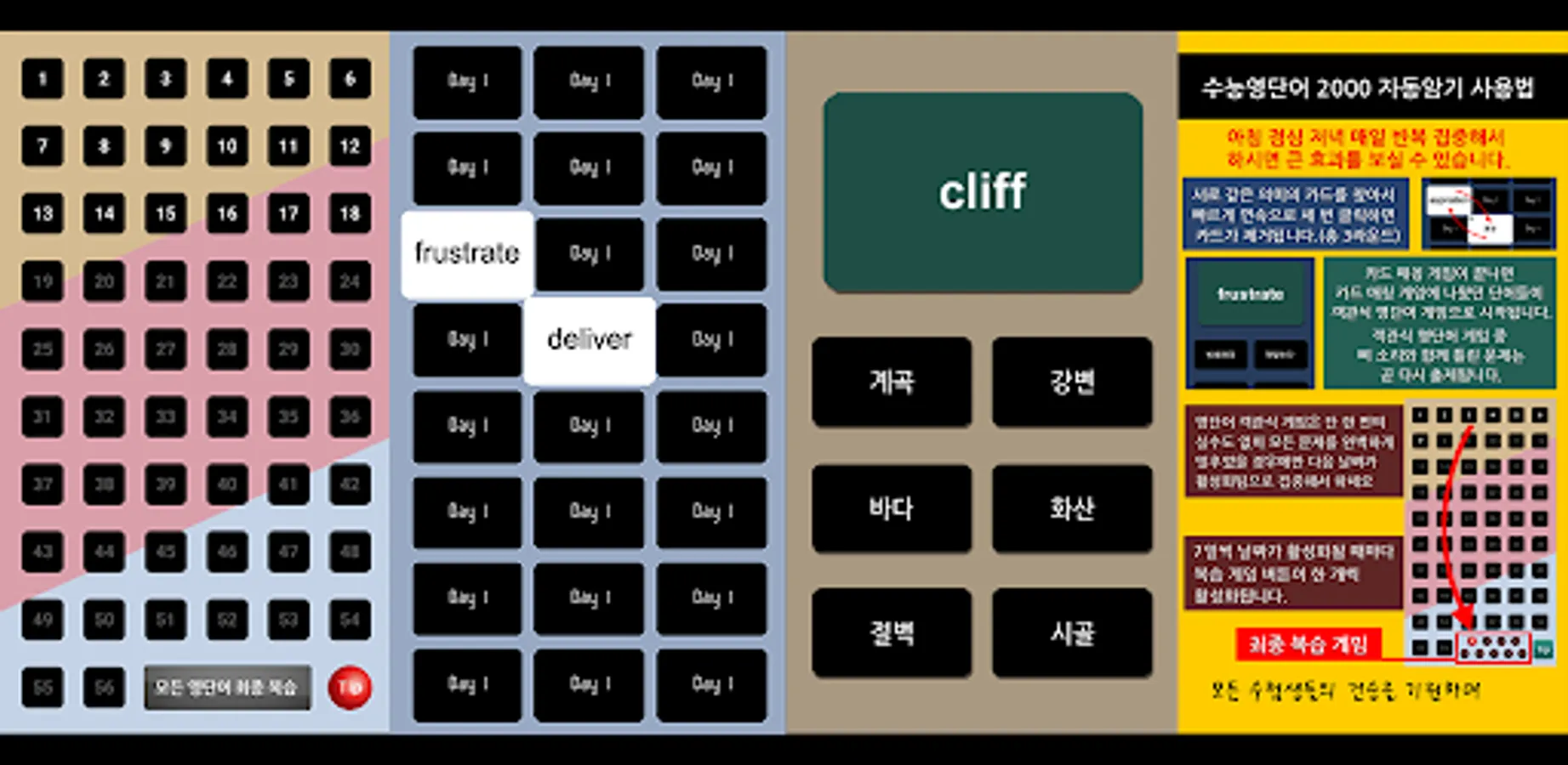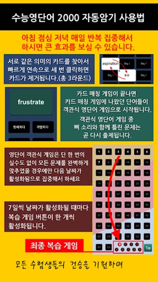 Easily memorize 2000 basic English words that are frequently asked in the CSAT while playing the fun game.