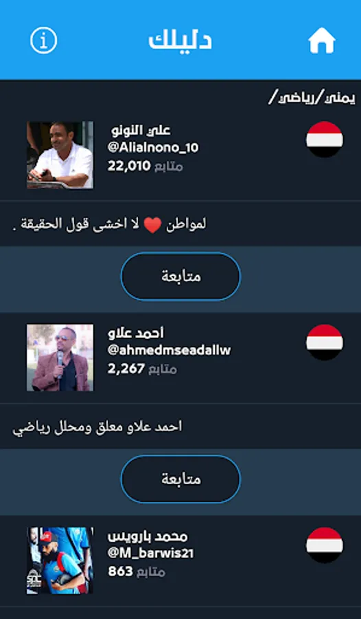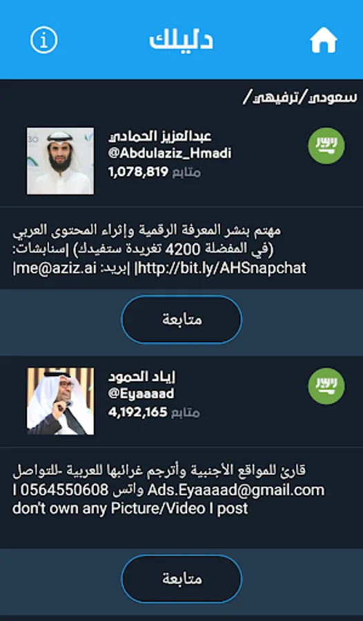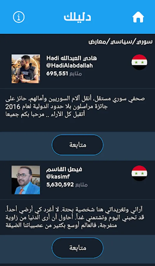 يساعدك هذا التطبيق على الدخول في عالم تويتر العربي من خلال تقديمه للمستخدم حسابات عربية في تويتر من مختلف المجالات مثل السياسية او الرياضية والترفيهية. حسابات من كل البلاد العربية، من قطروالسعودية شرقاً حتى المغرب والجزائر غرباً. تابع اخبار البلد الذي تختار اول بأول من خلال متابعتك للحسابات المنتمية لهذا البلد وليتضح لك كثير من احوالها. يختصر عليك هذا التطبيق الوقت والجهد في البحث عن حسابات عربية سواء كانت سياسية او رياضية او ترفيهية. تطبيق دليلك في تويتر يجعل كل العالم العربي بين يديك!!