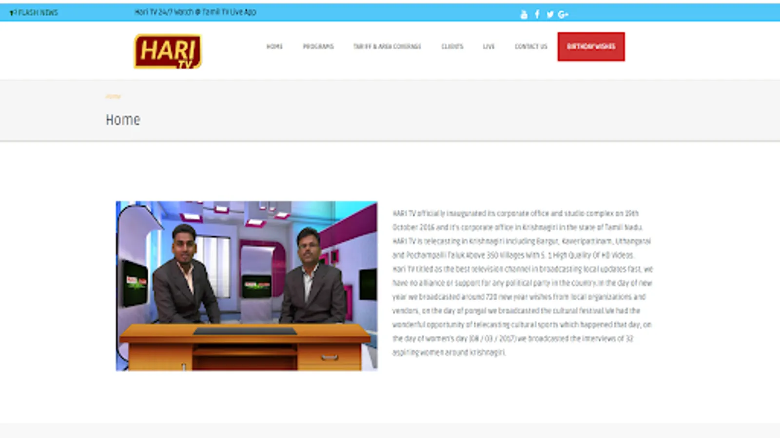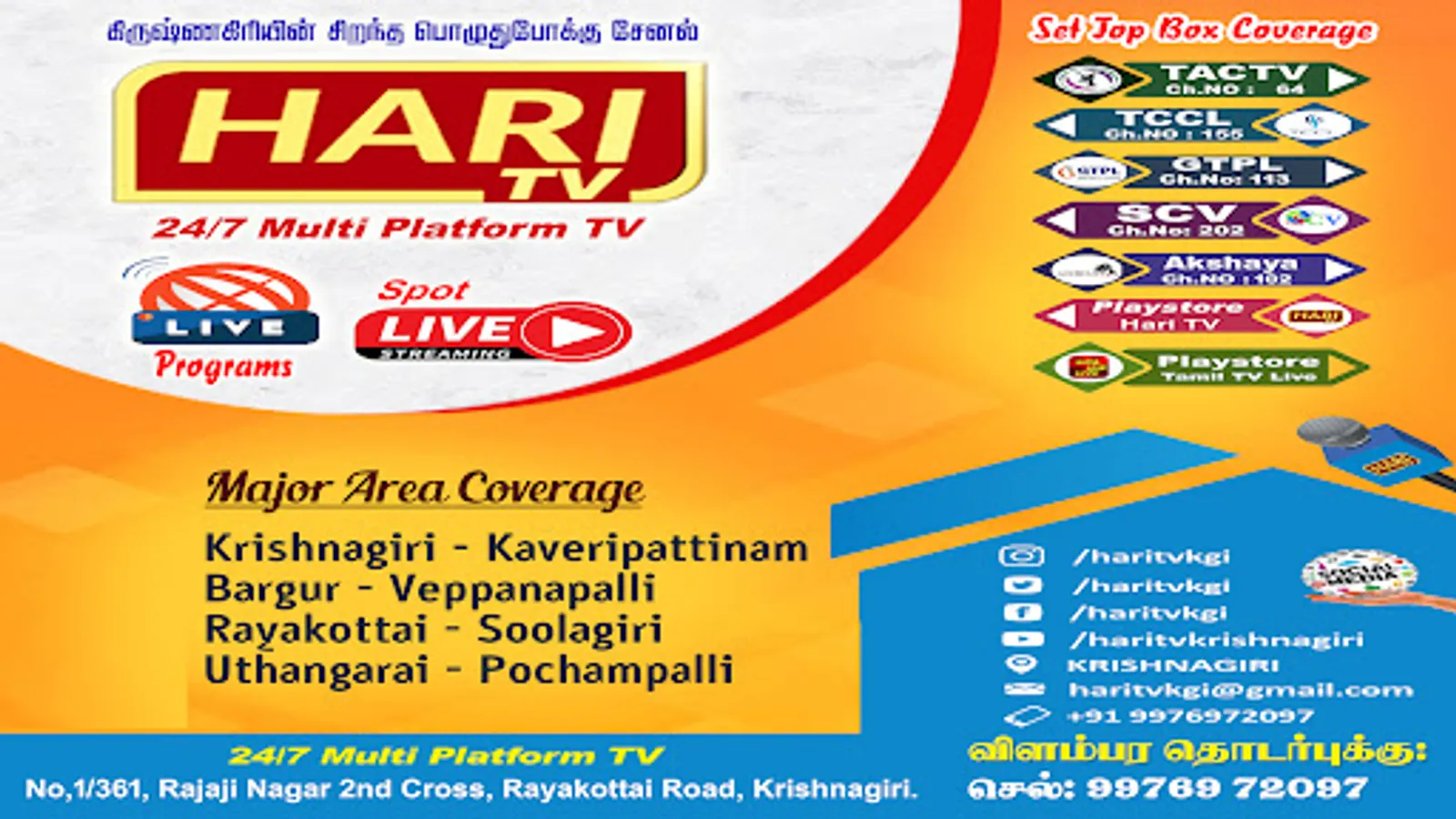 HARI TV officially inaugurated its corporate office and studio complex on 19th October 2016 and It's corporate office in Krishnagiri in the state of Tamil Nadu. HARI TV is telecasting in Krishnagiri Including Bargur, Kaveripattinam, Uthangarai and Pochampalli Taluk Above 350 Villages With 5. 1 High Quality Of HD Videos