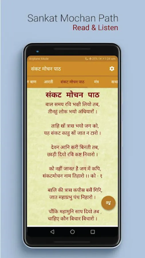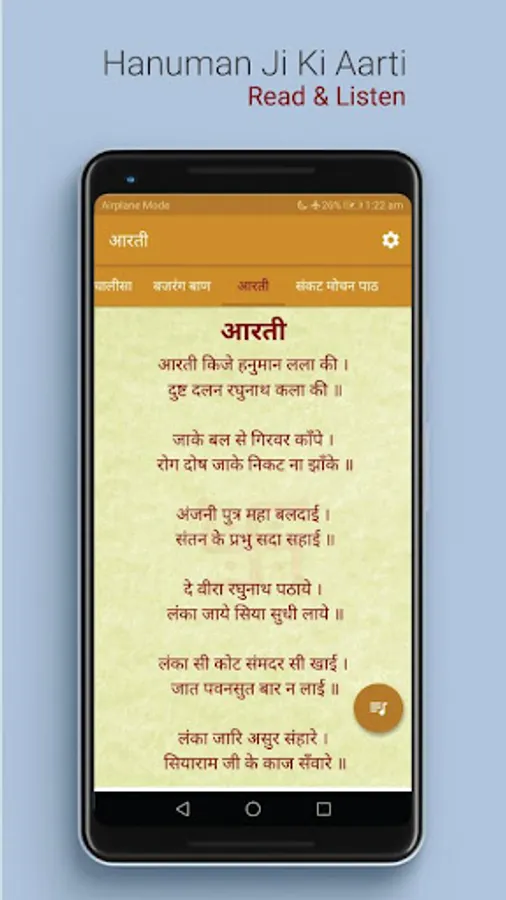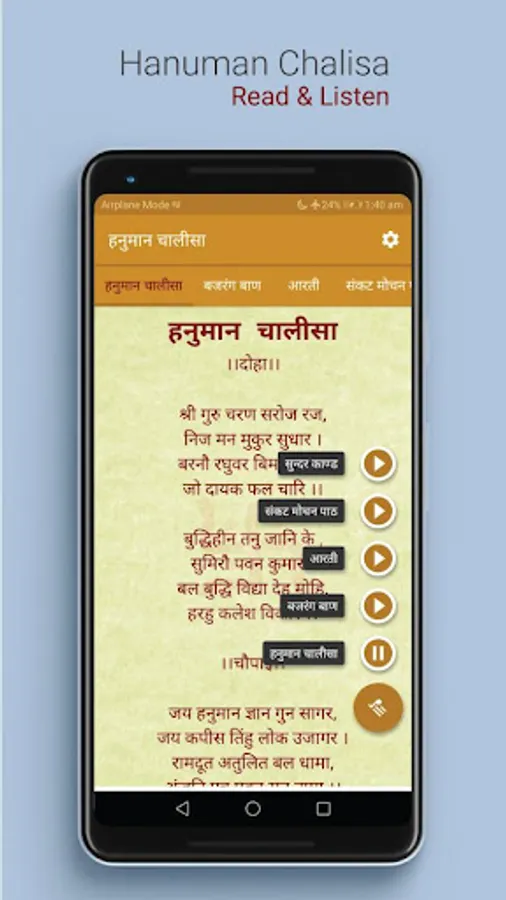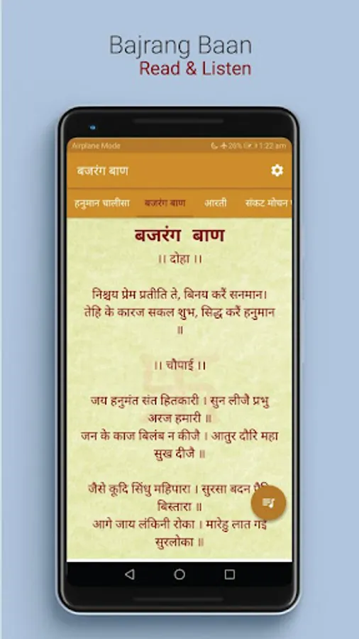Hanuman_Chalisa is one among the good poetic works of Goswami Tulsidas. Repeat aloud hanuman chalisa book also helps in overcoming the bad cause of the Saturn. It is said that the recite of the Chalisa in the night has some miraculous effect on the person. Chalisa sangrah app is best to use anytime to chant bajrangi hanuman baan and chalisa of hanuman.
