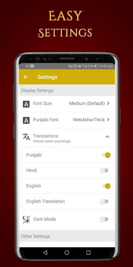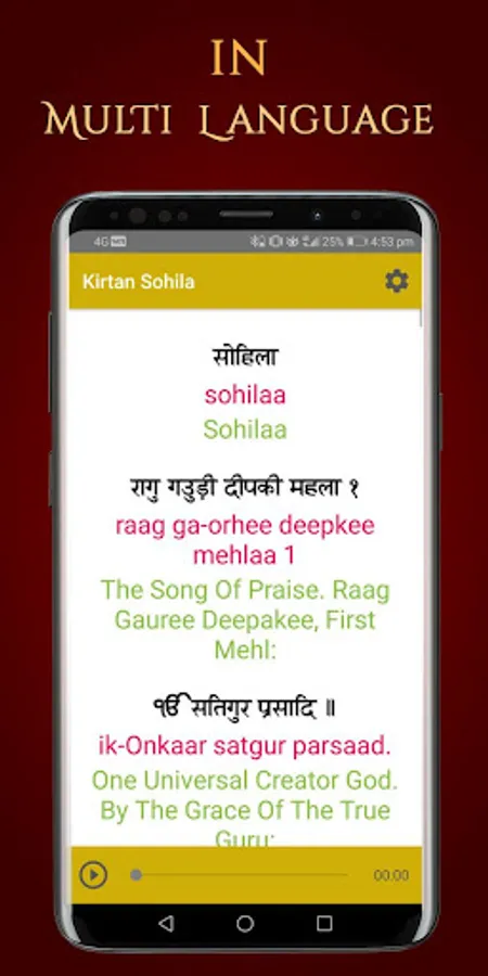 Also here simple design application provides you features like Kirtan Sohila Path Hindi and Sohila Sahib Path with audio as well as multi languages supported lyrics.