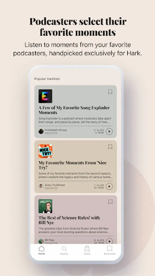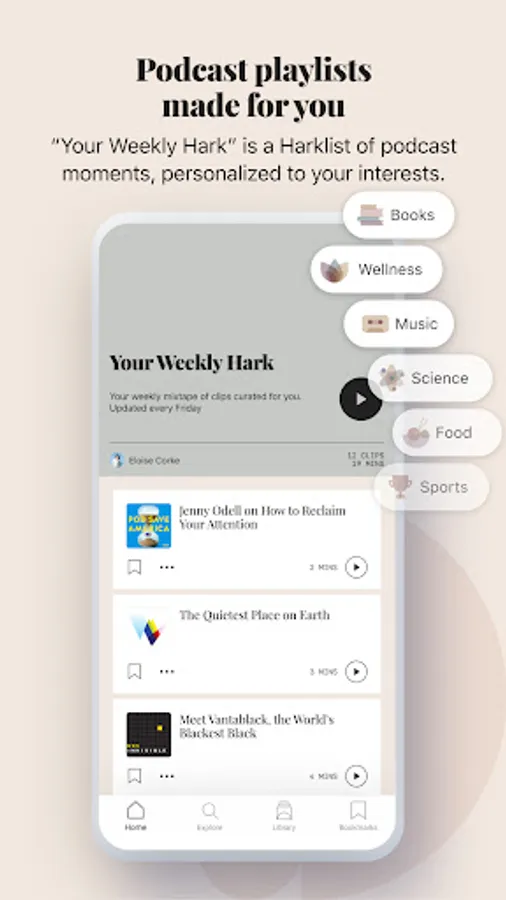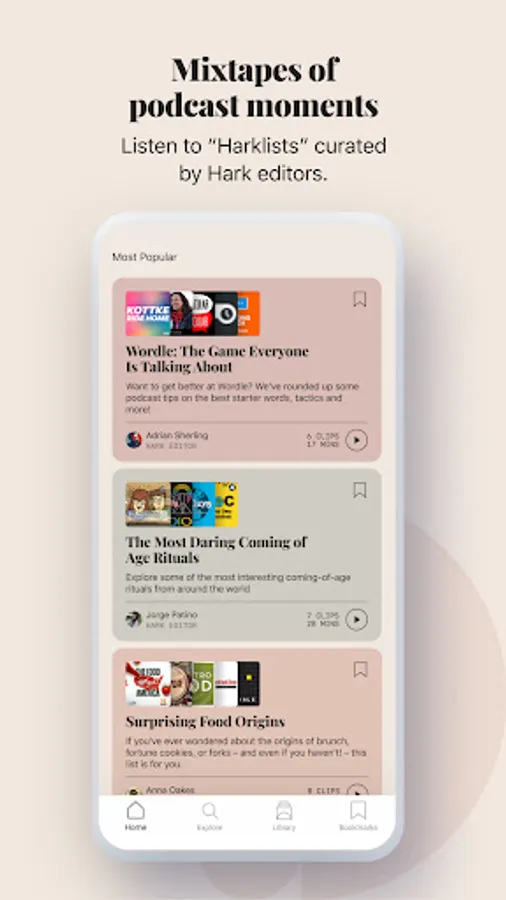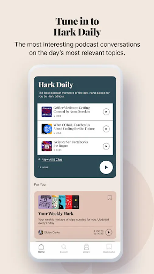 Hark is a new way to experience the best of podcasts. Hark editors are podcast-obsessives who clip moments of podcast genius and curate them into Harklists - our own take on podcast mixtapes. Each day, we create Harklists to make you laugh, give you multiple perspectives on a topic, and find your next favorite show. All in less time than it takes to listen to a single episode.