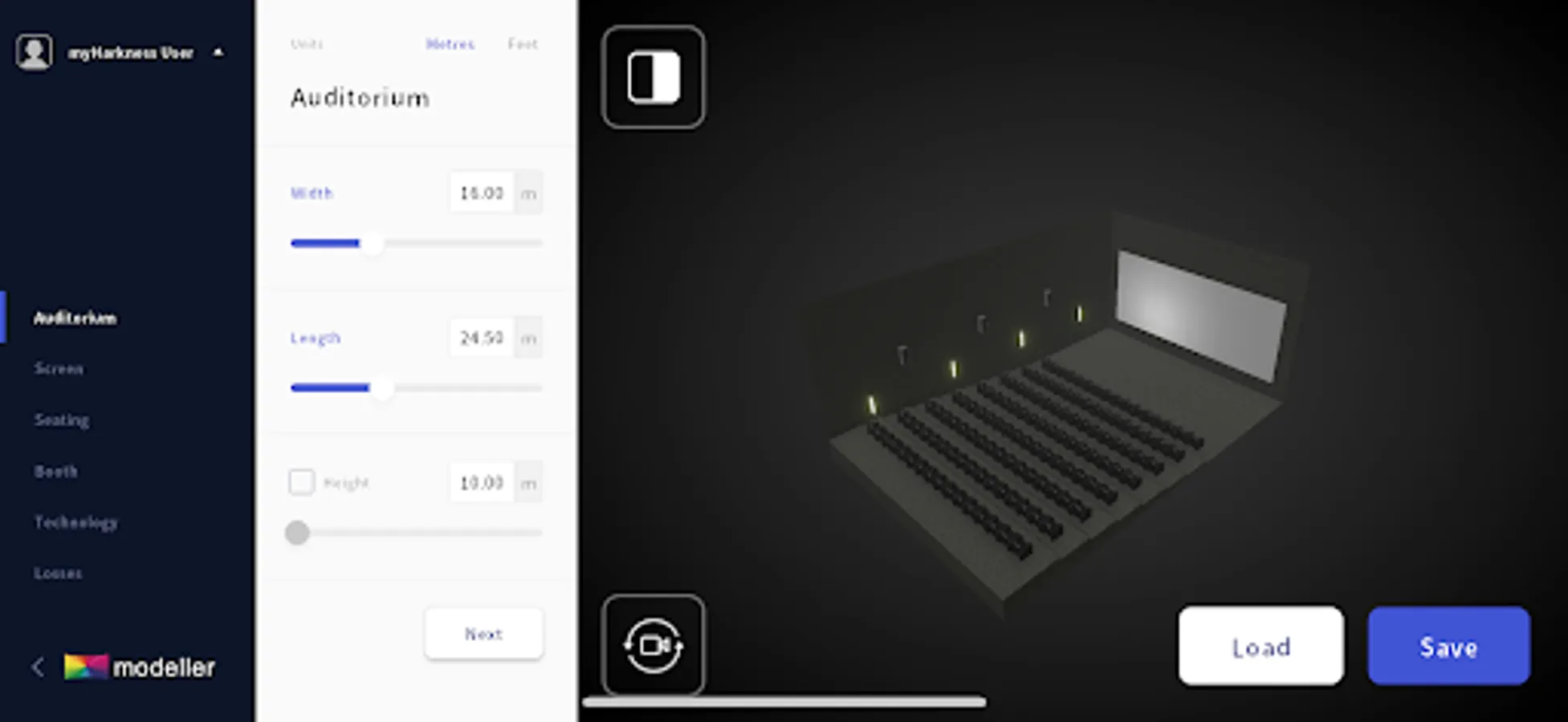 The second tool in the myHarkness workflow, the myHarkness Modeller enables cinema professionals to design cinema auditoria digitally helping them to explore design ideas and technical configurations before they’re even built.