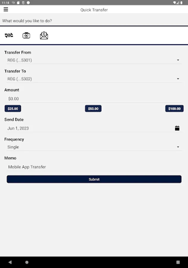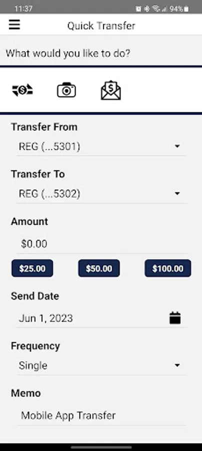 View account balances, see recent activity, transfer funds between accounts, and deposit checks by taking a picture of the front and back of the check.