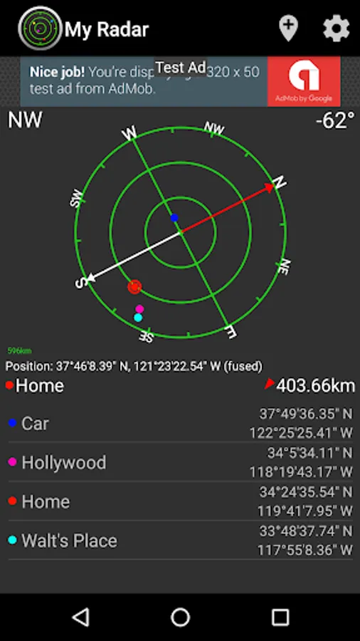 My Radar makes it fun to track and locate items and places of interest to you. Using My Radar's bright radar display you can easily track locations in relation to your current global position. It's a fun way to find your car, your friends, your home or any other place you want.
