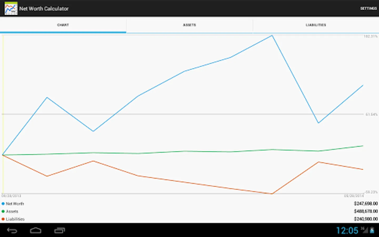 With asset and liability values in place, Net Worth Calculator generates an attractive chart clearly showing the change in asset values, liability values and net worth over time. The chart can also be represented as a percentage change or a moving percentage change. With the aid of the charts, you will be able to easily visualize your personal journey to financial security and greater financial wealth.