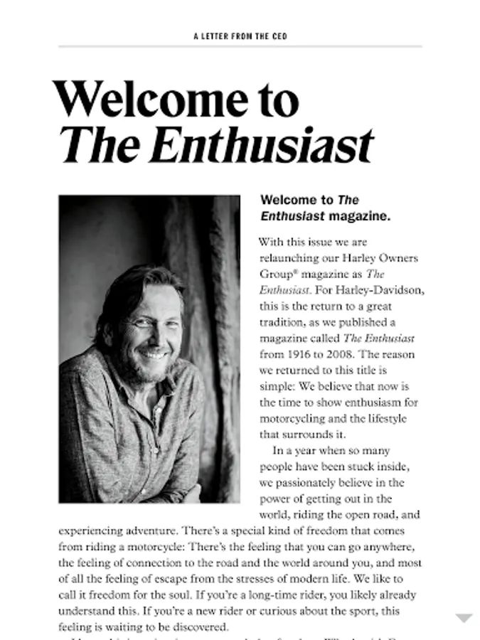 The Enthusiast is a print and digital magazine celebrating motorcycle culture and the riding lifestyle through the lens of the Harley-Davidson brand.