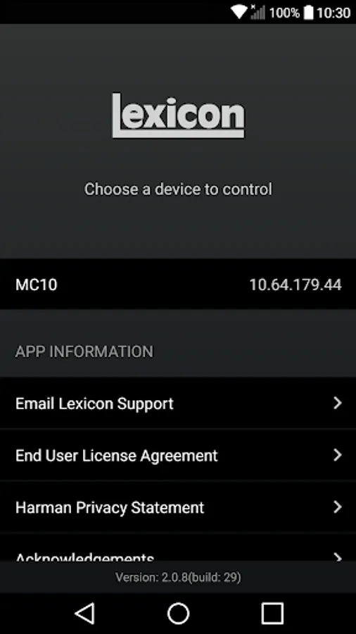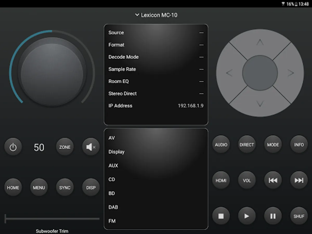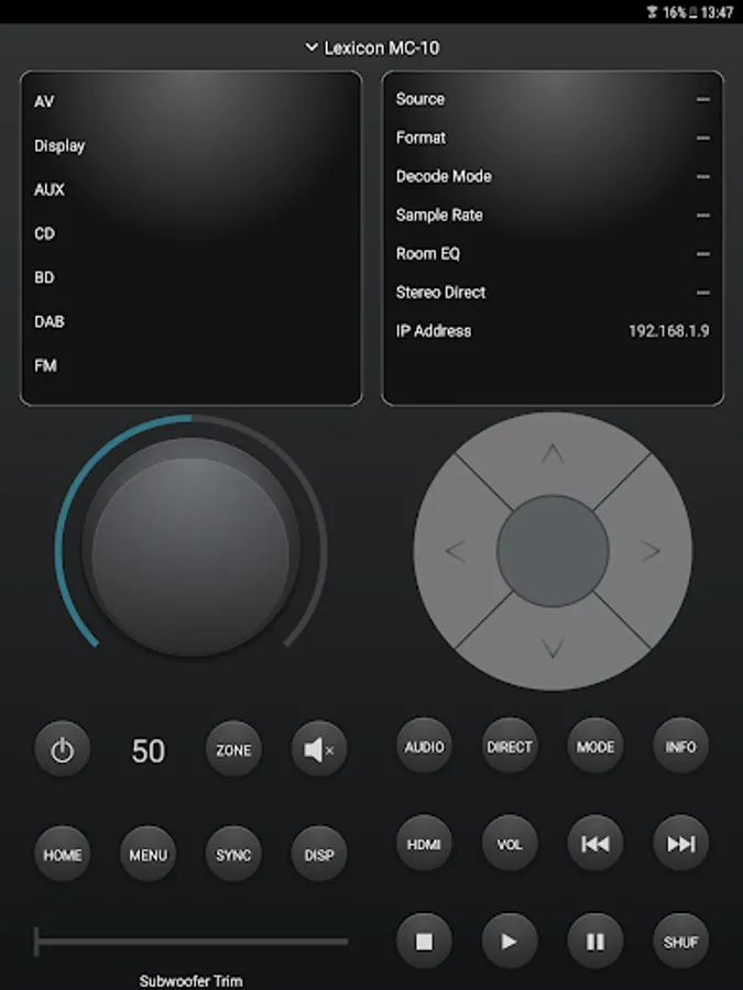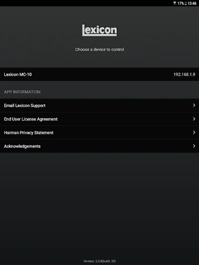 Remotely control your Lexicon device using your Android device. Connect using your home network, providing feedback from your device and eliminating any line-of-sight issues present with infrared remote control.