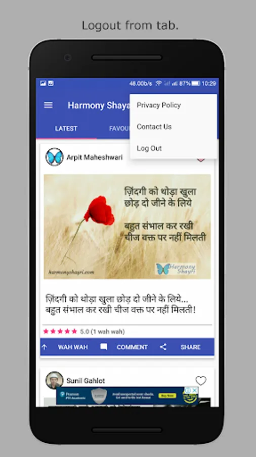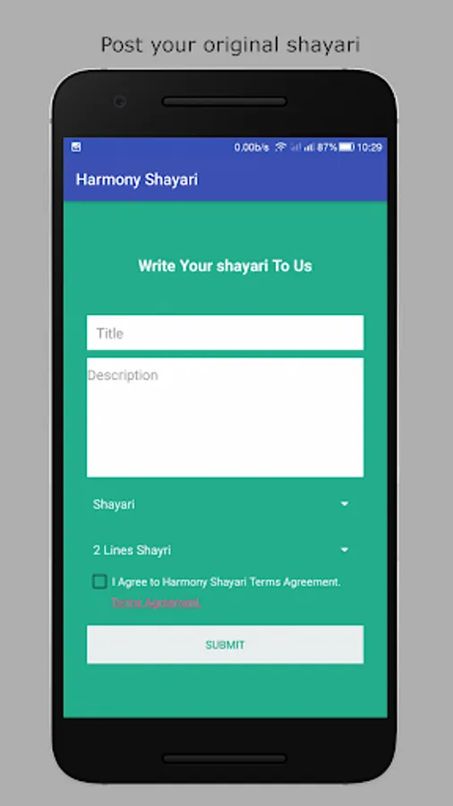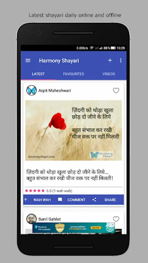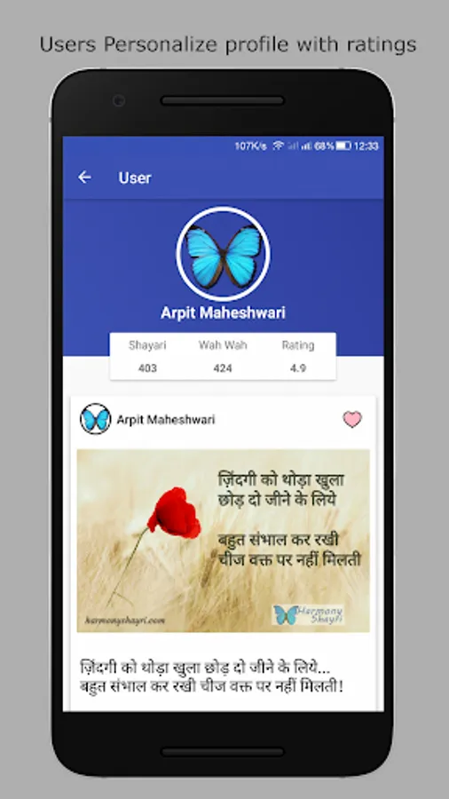 Harmony Shayari update you daily with the fresh feed of Shayari which can represent your emotion to your loved ones in the poetic way which is the best method to say anything. This is best Hindi Shayari app to refer and use. And the need for it is obvious! It assures simple, safe and content-rich platform where you can find amazing poetic creativity, meaning and content.