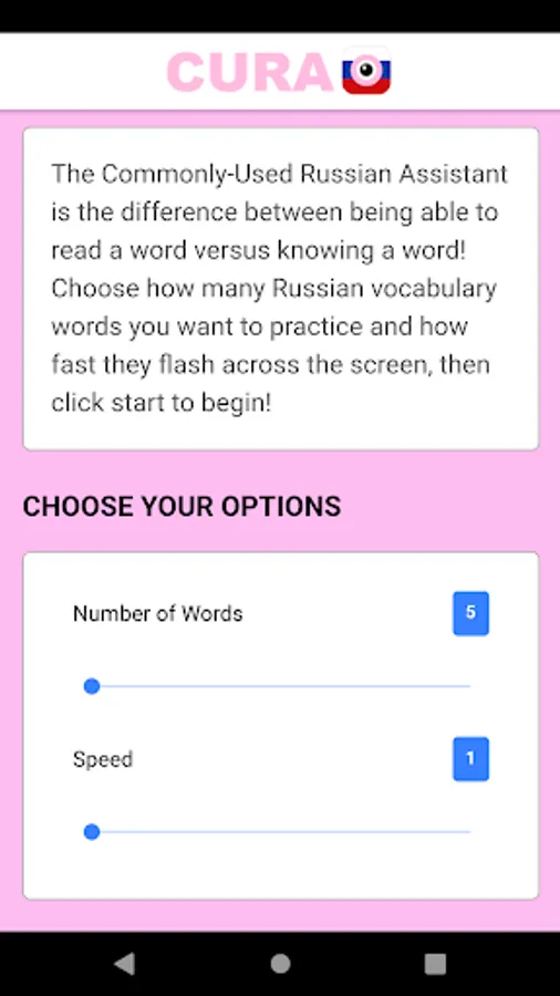 The program will present a Russian word to you in a limited amount of time and you will have to learn to recognize the word instantly once you read it. Depending on your skill level, at the highest speeds, there is almost no time to decipher every character in the alphabet, you just have to know what the word means just by looking at it. The word bank consists of 100 of the most commonly used Russian words and is a great start to building your elementary vocabulary!