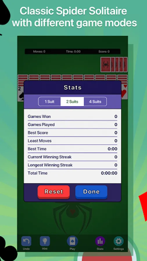 • Three levels of difficulty including: 1 Suit, 2 Suits, and 4 Suits