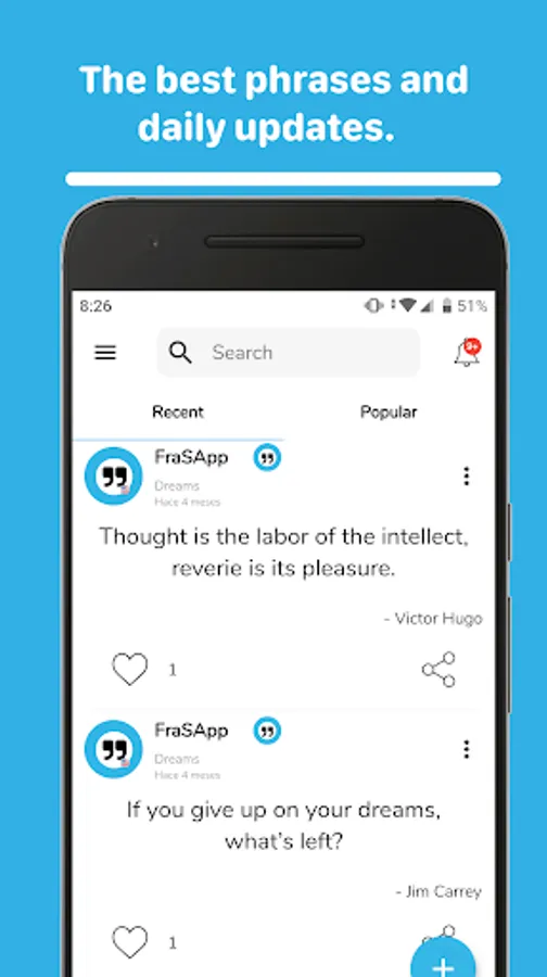 Join the best and largest community of quotes in Spanish, English and Portuguese, if you like to share images of beautiful quotes, quotes to fall in love on Social Networks and instant messaging Apps, you need status for WhatsApp or status on Facebook and Instagram or quotes for Twitter, well fraSApp - With Images allows you to bring the best Images and quotes on your Mobile for you to Share.