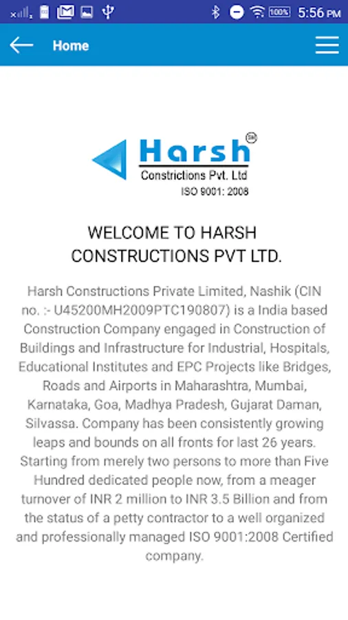 Harsh Constructions Private Limited, Nashik (CIN no. :- U45200MH2009PTC190807) is a India based Construction Company engaged in Construction of Buildings and Infrastructure for Industrial, Hospitals, Educational Institutes and EPC Projects like Bridges, Roads and Airports in Maharashtra, Mumbai, Karnataka, Goa, Madhya Pradesh, Gujarat Daman, Silvassa. Company has been consistently growing leaps and bounds on all fronts for last 30 years.
