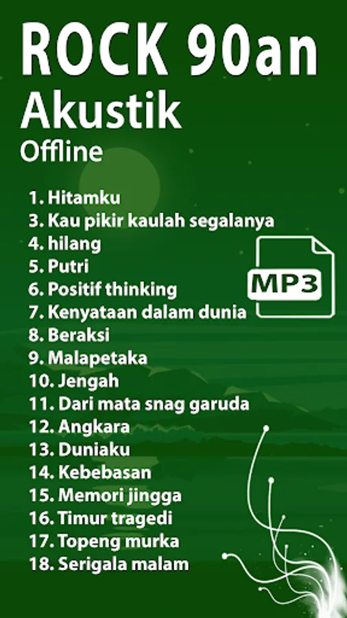In the complete acoustic 90s rock mp3 application, users can play music at will. Besides that, this offline collection of 90s rock songs can also be listened to offline acoustic mp3s. So you don't need to worry, all fans of old 90s rock songs can play acoustic rock mp3s wherever music is spoiled.