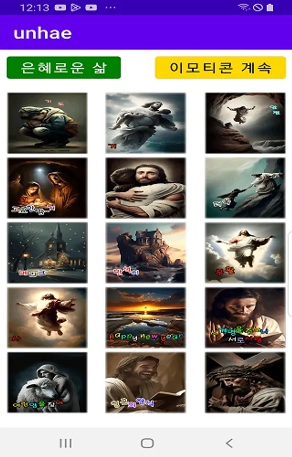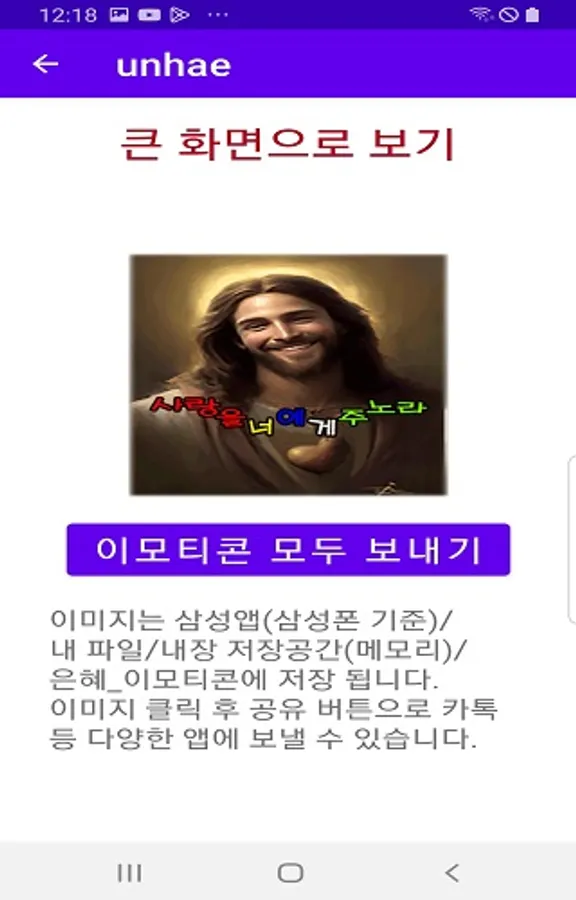 Emoji related to Christianity. Since the app's file is a gif (moving) file, it is not supported depending on the type of device, so it is inevitably designed to be used after saving it to a file without sharing it directly from the app. Saved images can be used in the following process (Samsung App (based on Samsung App)/My Files/Built-in storage space (memory)/Grace_Emoji). You can press the emoticon and use the Share button at the bottom of the screen to use it in Kakao Talk, Message, or Band. There will be no more joy as a developer if you can give strength to the people around you through emoticons. thank you