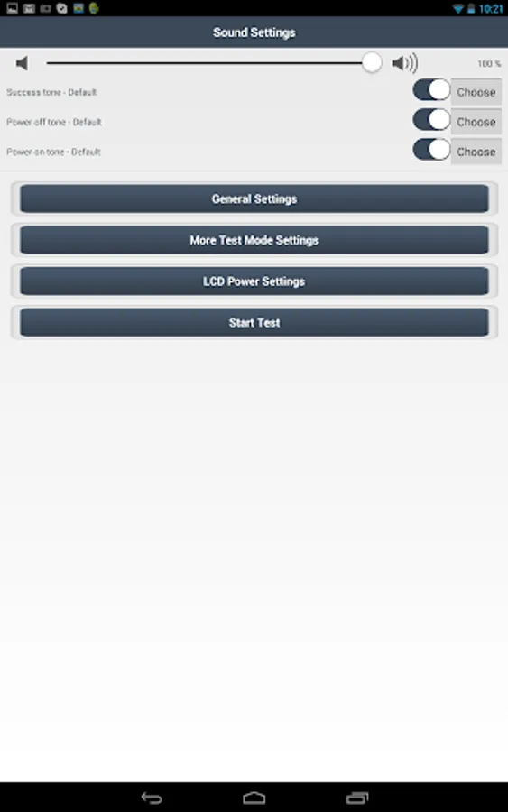 * Audible sound tones for testing complete and screen power on/off.
